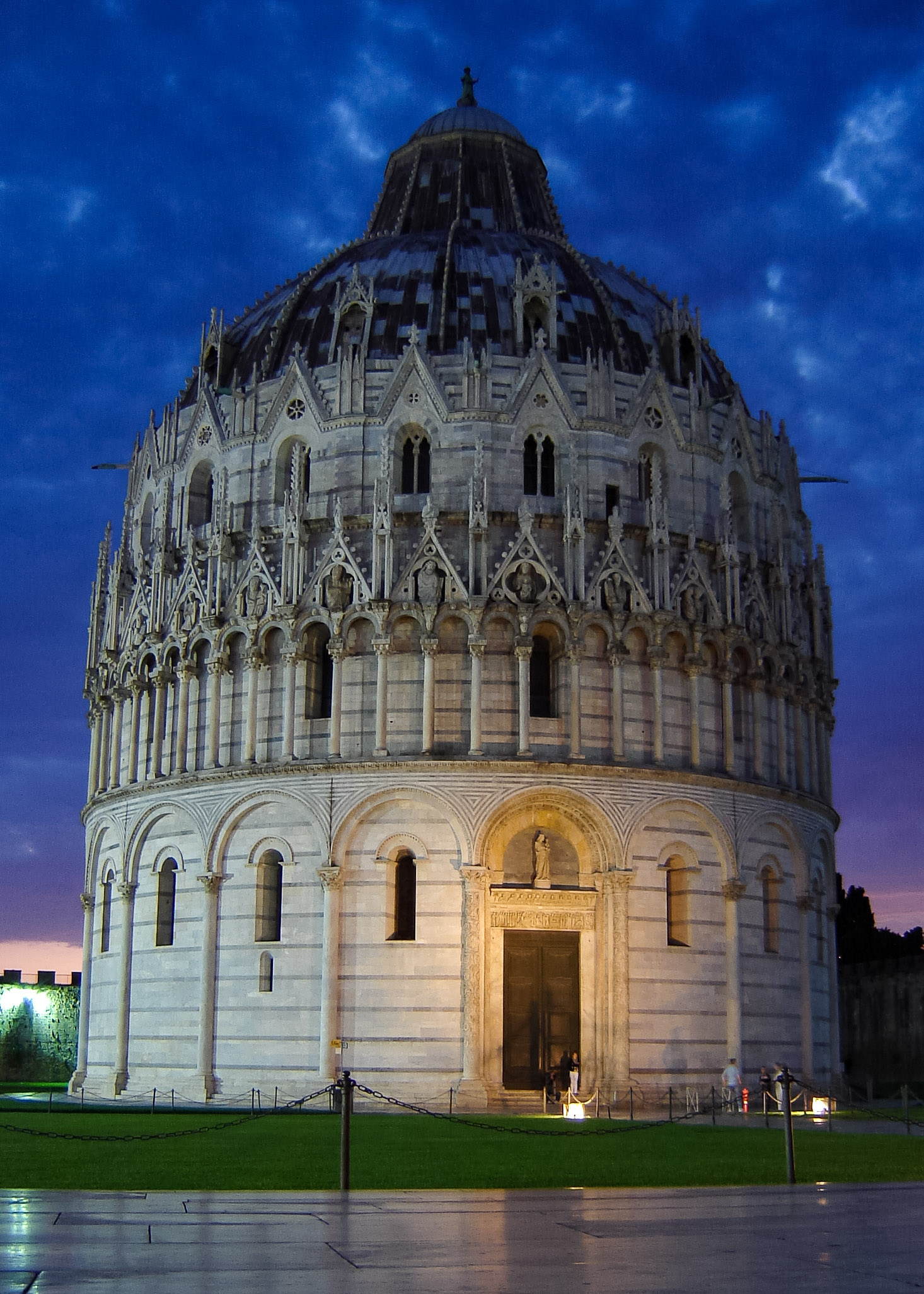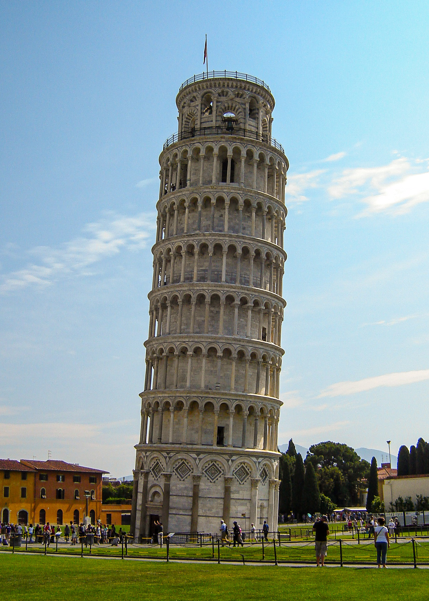 The shining white stone architecture of the Leaning Tower, Duomo and Baptistry is set off by spotless green and lush lawns.