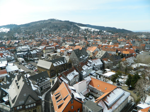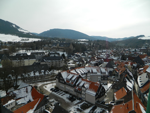 We climbed the 60 meters up inside the 12th century bell-tower to enjoy the views of snowy streets winding out from the Markt Platz.