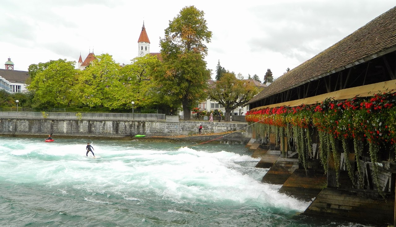 There are two of these bridges which as well as providing access to the island, also act as damns which regulate the flow of the river through the town. The fast gushing waters were being surfed and rafted on by local youngsters so we joined the passers-by cheering them on.