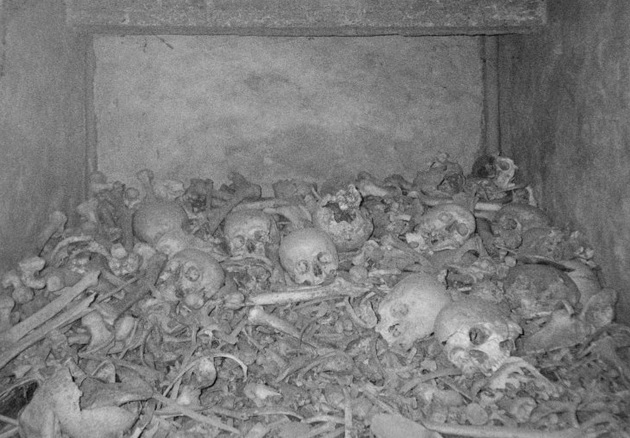 Skulls rolled on top of jaws, femurs and fingers, spines, hip bones, knee caps, metatarsals and feet. I felt foolish and ill. Of course, an Ossuary is an open grave of bones above ground. Reeling from the enormity of the evidence of human destruction I staggered down through the construction site to find Simon.