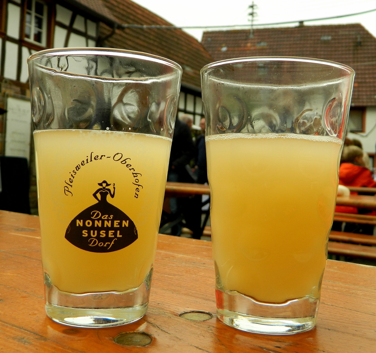 The new wine was served in quarter and half litre glasses and was a cloudy yellow colour, very grapey in taste and yeasty.