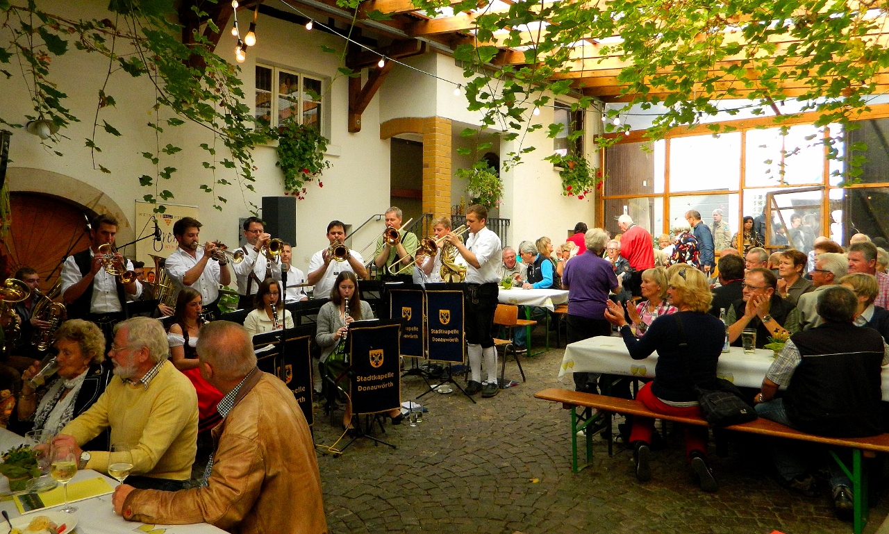 A brass band pumped out oompah and traditional tunes that the tables full of eating and drinking people sang and clapped cheerily along to.