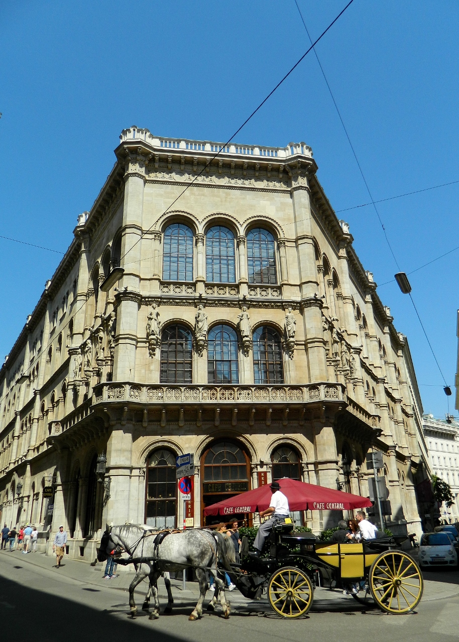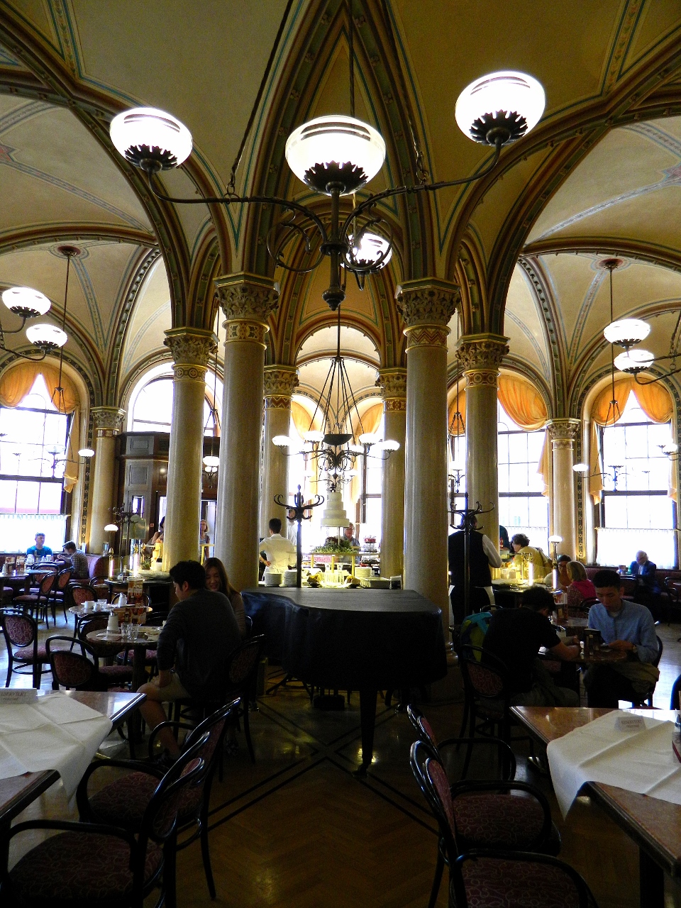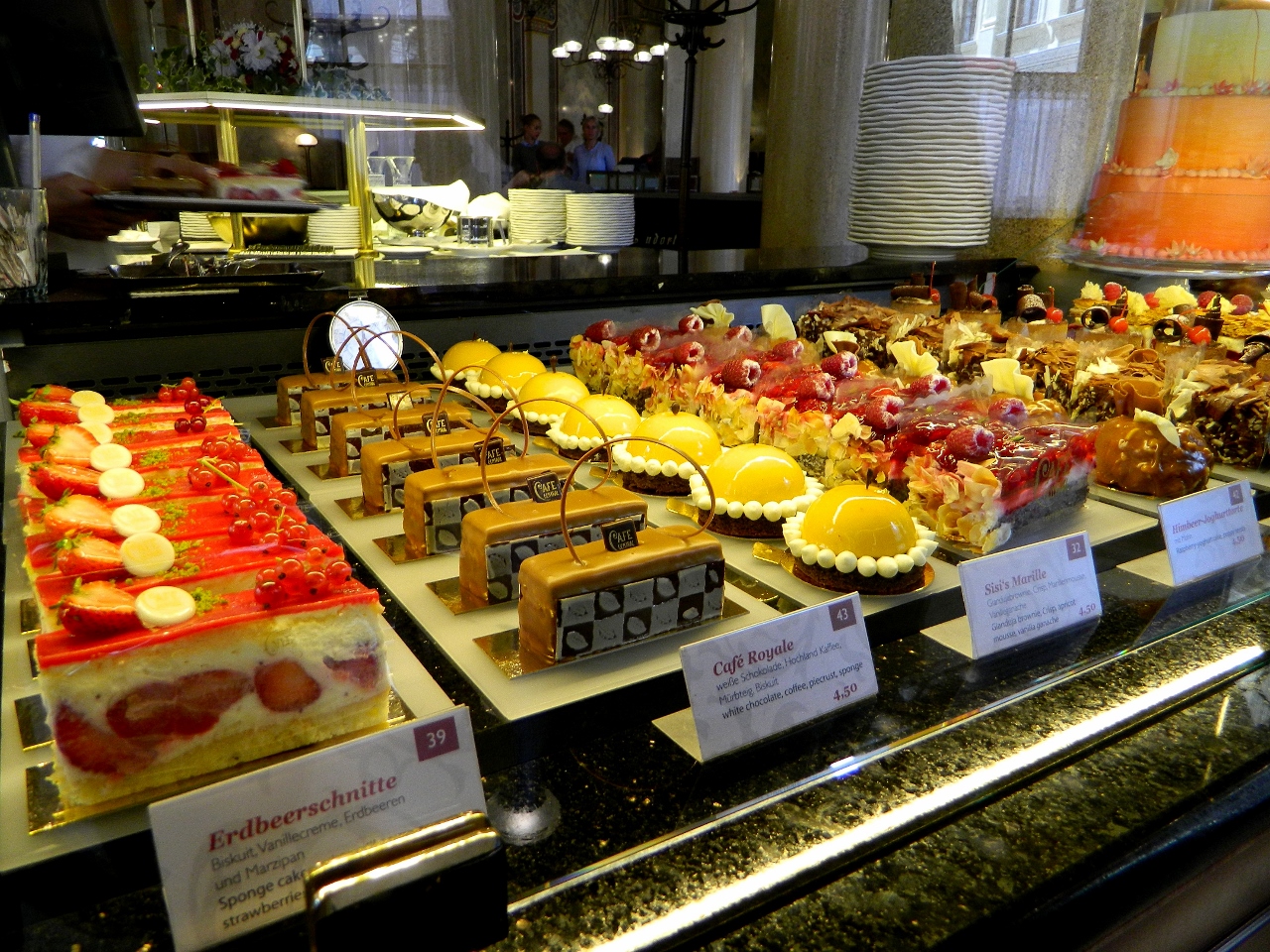 Food and wine is very much part of the city’s daily life. Arriving each day by 10am we saw that the street vendors were already cooking and selling quantities of hot wurst, kebabs, noodles, pasta and pizzas. We treated ourselves to morning coffee and cake Viennese-style in the historic Central Café where Sigmund Freud and other brilliant minds of the 19 century lingered over dark Turkish coffee and towering plates of creamy and chocolate-filled cakes.