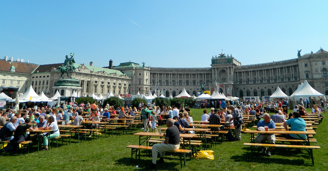 The Hofburg, or Royal Palace has been grandly extended since the 1200s. On Monday it hosted the annual festival of regional produce from Lower Austria. Benches were packed with families and lunching workers enjoying roasted meats, dumplings and sauerkraut served from tented stalls and washed down with beers and wine from independent producers. A bronze Archduke Karl on his towering horse galloped gallantly amongst the proceedings.