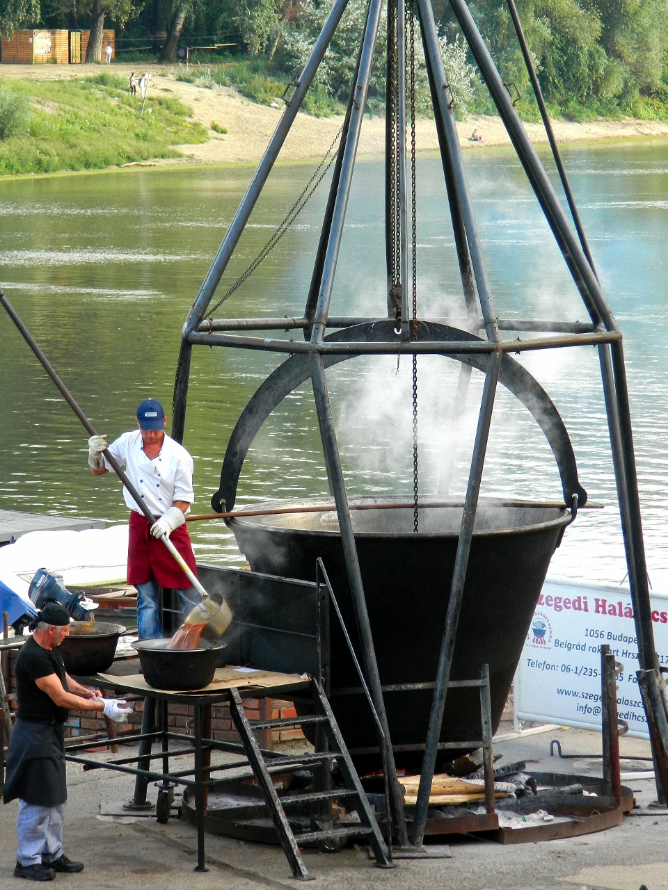 People danced to wild-sounding folk music and gulped down greedy mouthfuls of hot fish goulash served steaming from impossibly giant cauldrons that bubbled on top of wood fires. The aroma was alluring but on closer inspection the broth was greasy-looking and not especially appetising.