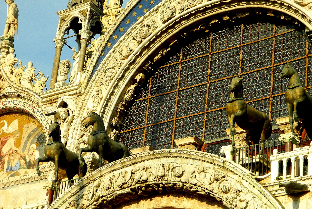The gold mosaics of the domed basilica shine especially in the late afternoon sun when the deep chimes from the bells of the tall brick campanile send hundreds of wheeling pigeons flying into the air.