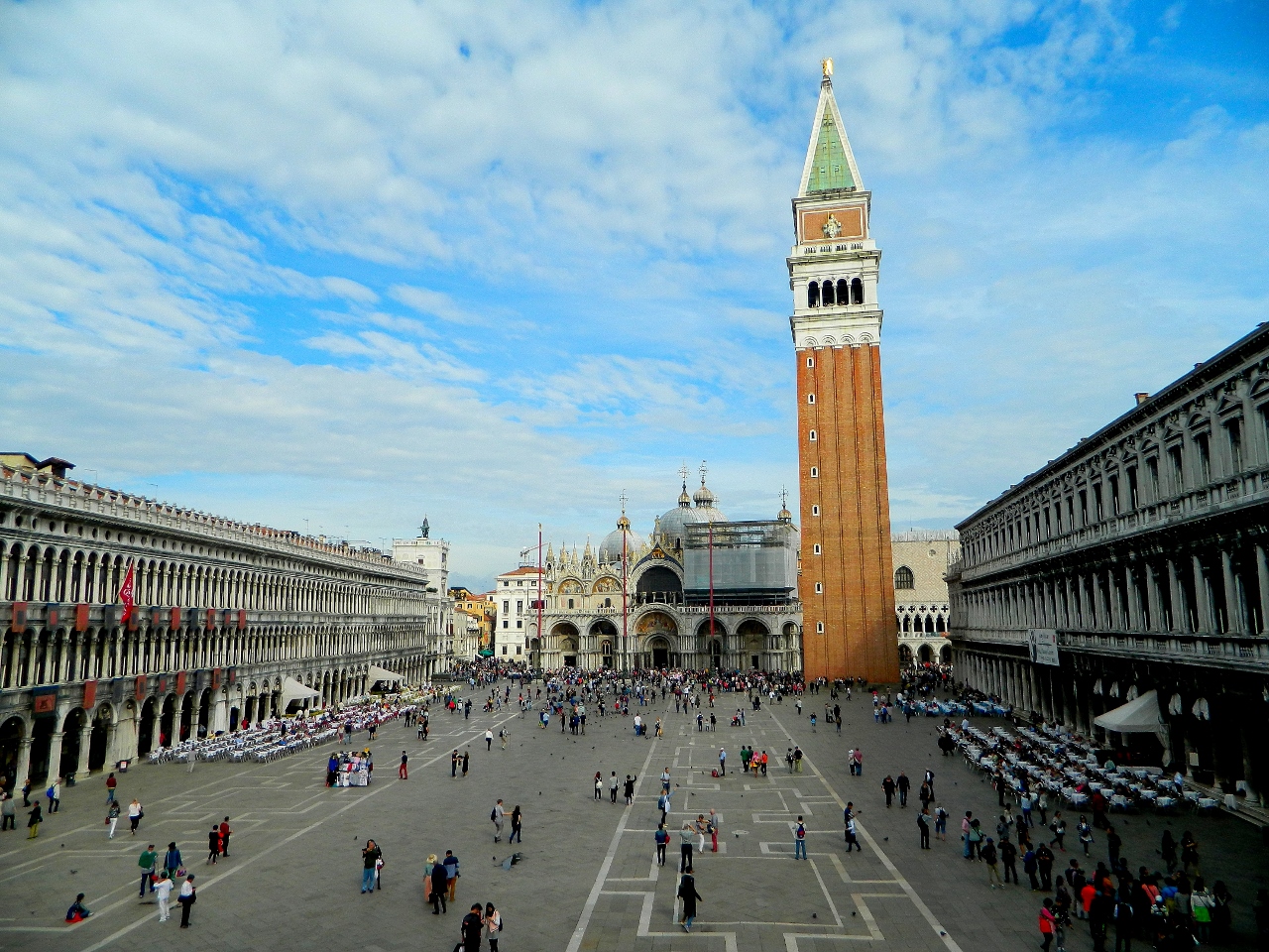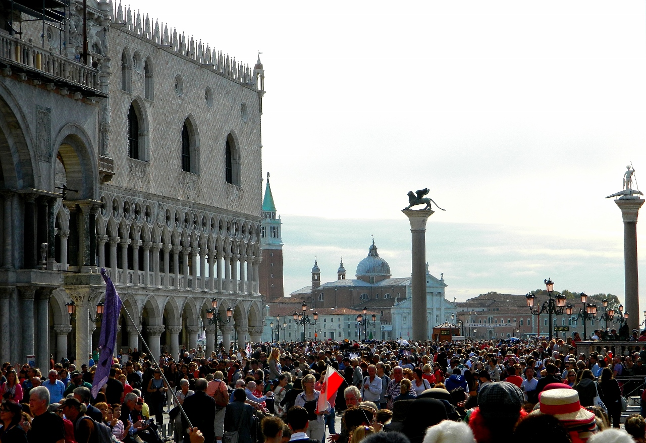 During the daytime a vast ocean of people of all nationalities crowd off gigantic cruise liners and water taxis onto the docks at San Marco and pour themselves into its historic square. The bustle begins at 10 o’clock.