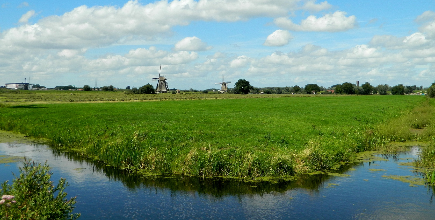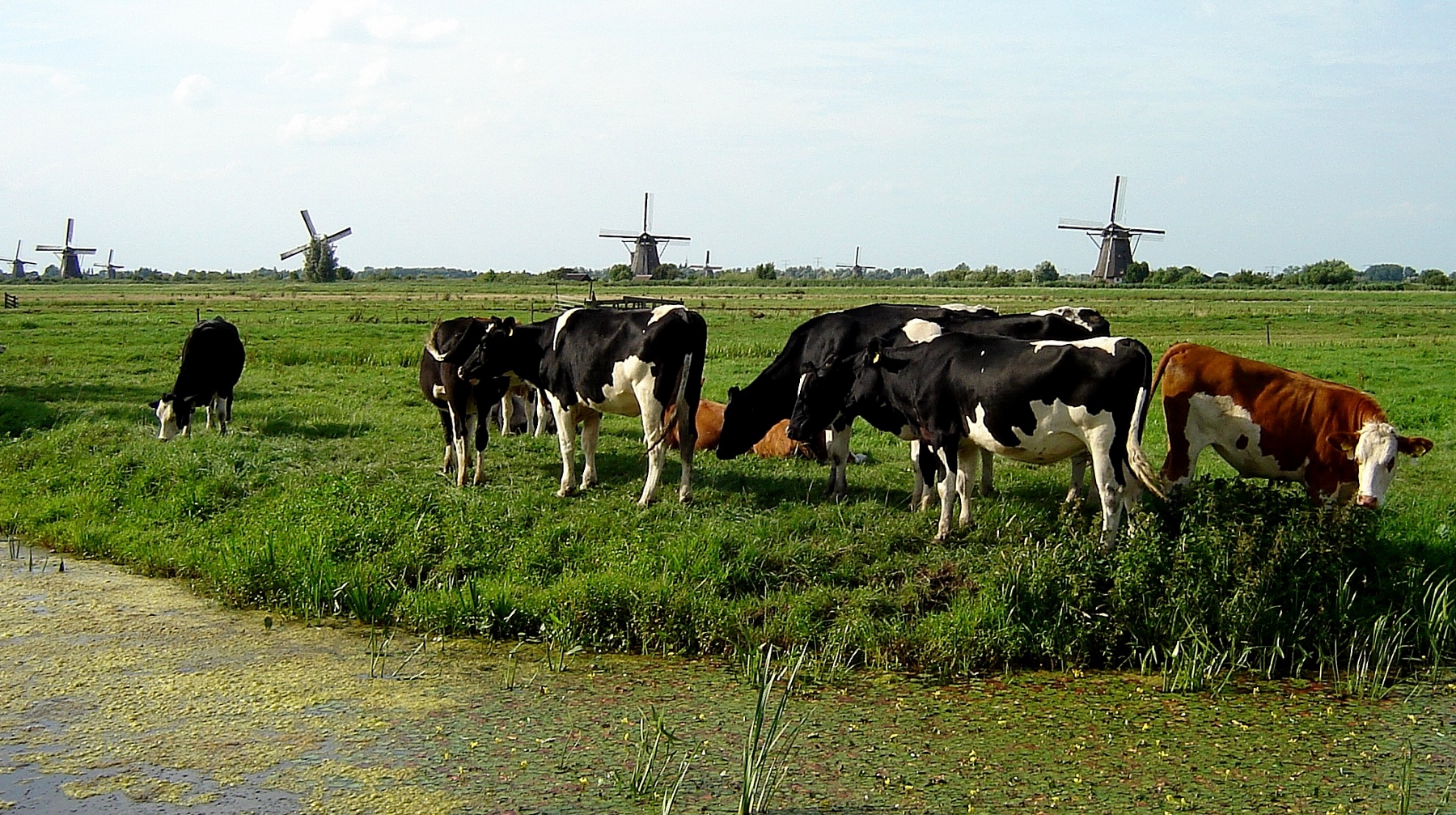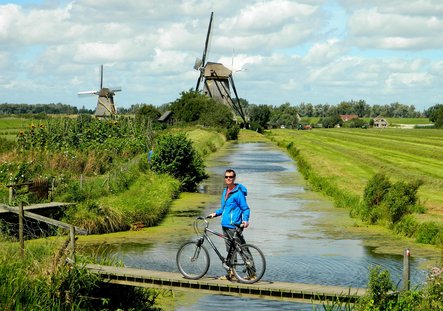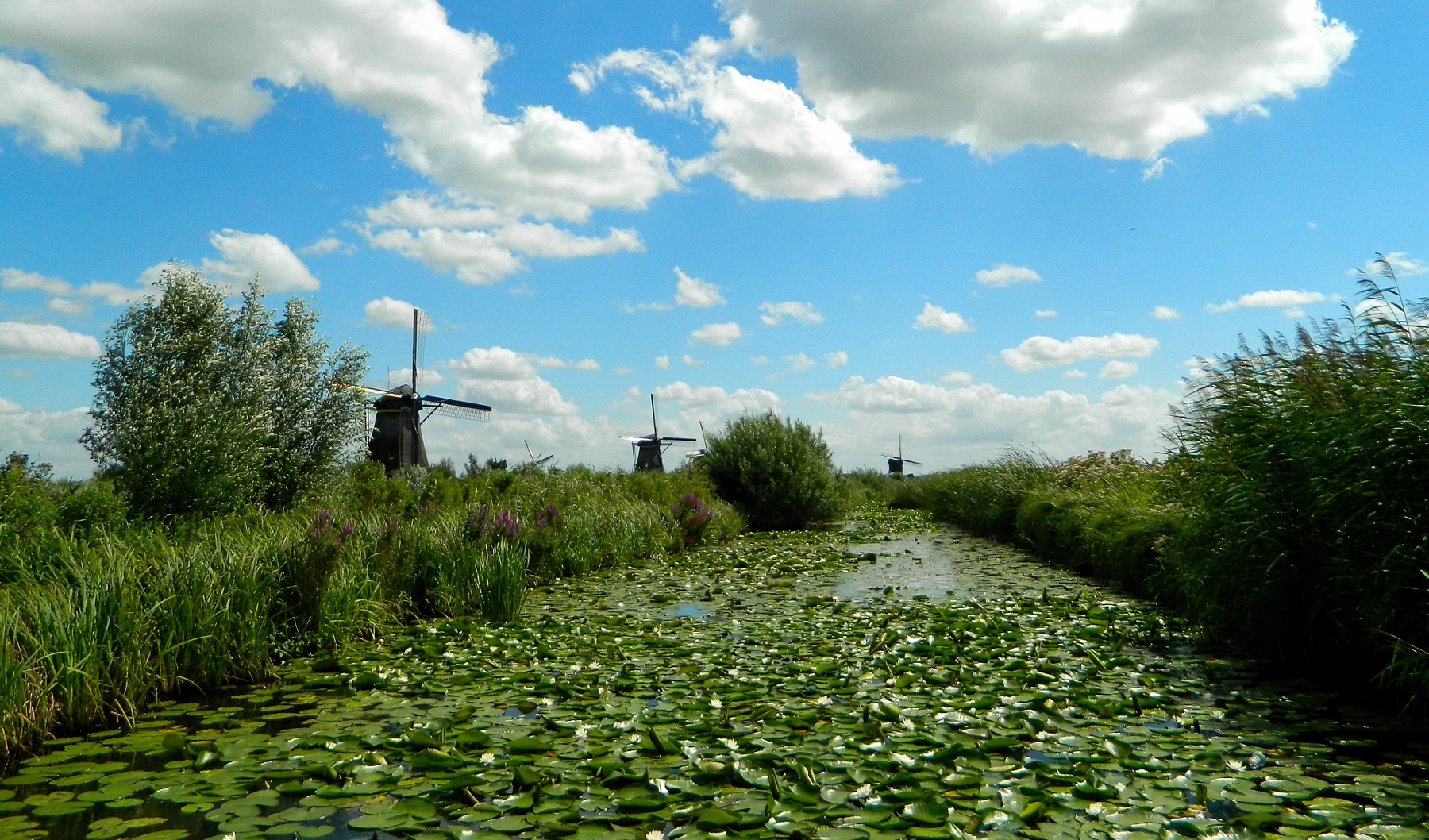 We retraced our earlier path alongside the windmills and found a picnic stop on a small wooden platform across a dike with Lilly pads underfoot and windmills to gaze upon. From the 1700s they were built to pump out the rising water from the land.