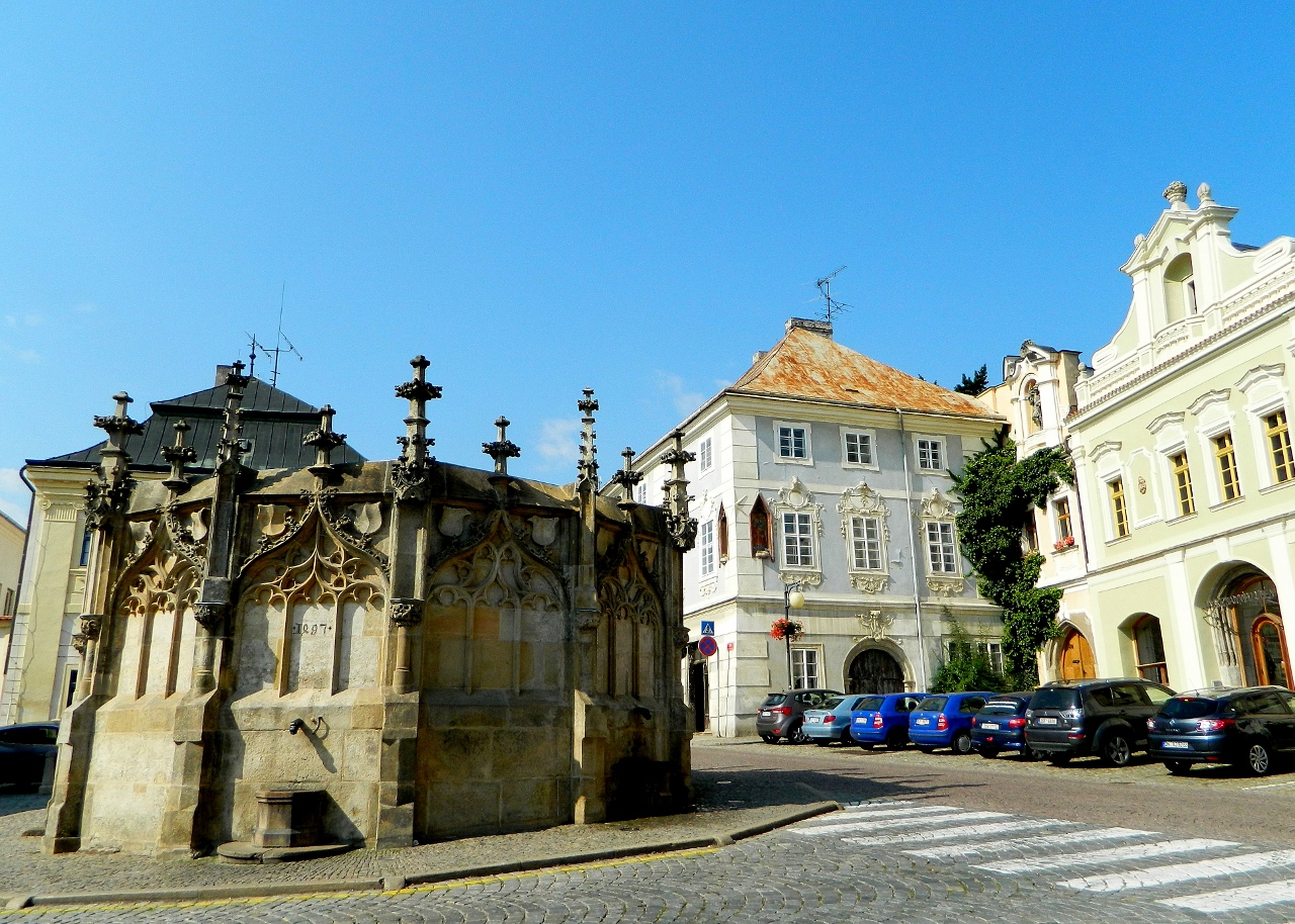 In the high heat of late morning, office workers and shoppers stopped at the striking stone and late Gothic drinking fountain which was created as part of the town’s early water distribution system around 1495 by the Master Bricci.