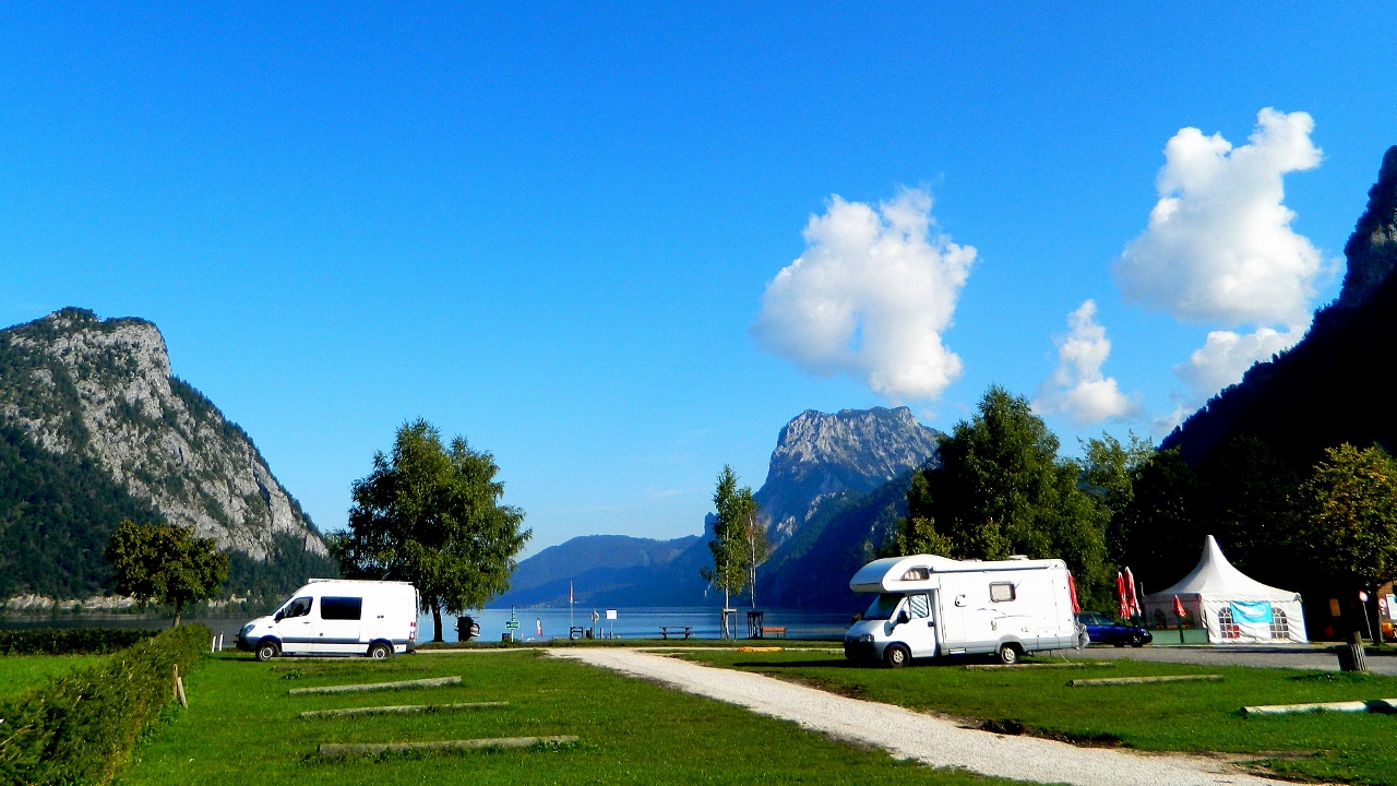 In the shallows, the silvery water glistened like a liquid gel across white sand. It was beautiful but not somewhere we could stay, so we ventured along its west bank to Ebensee.