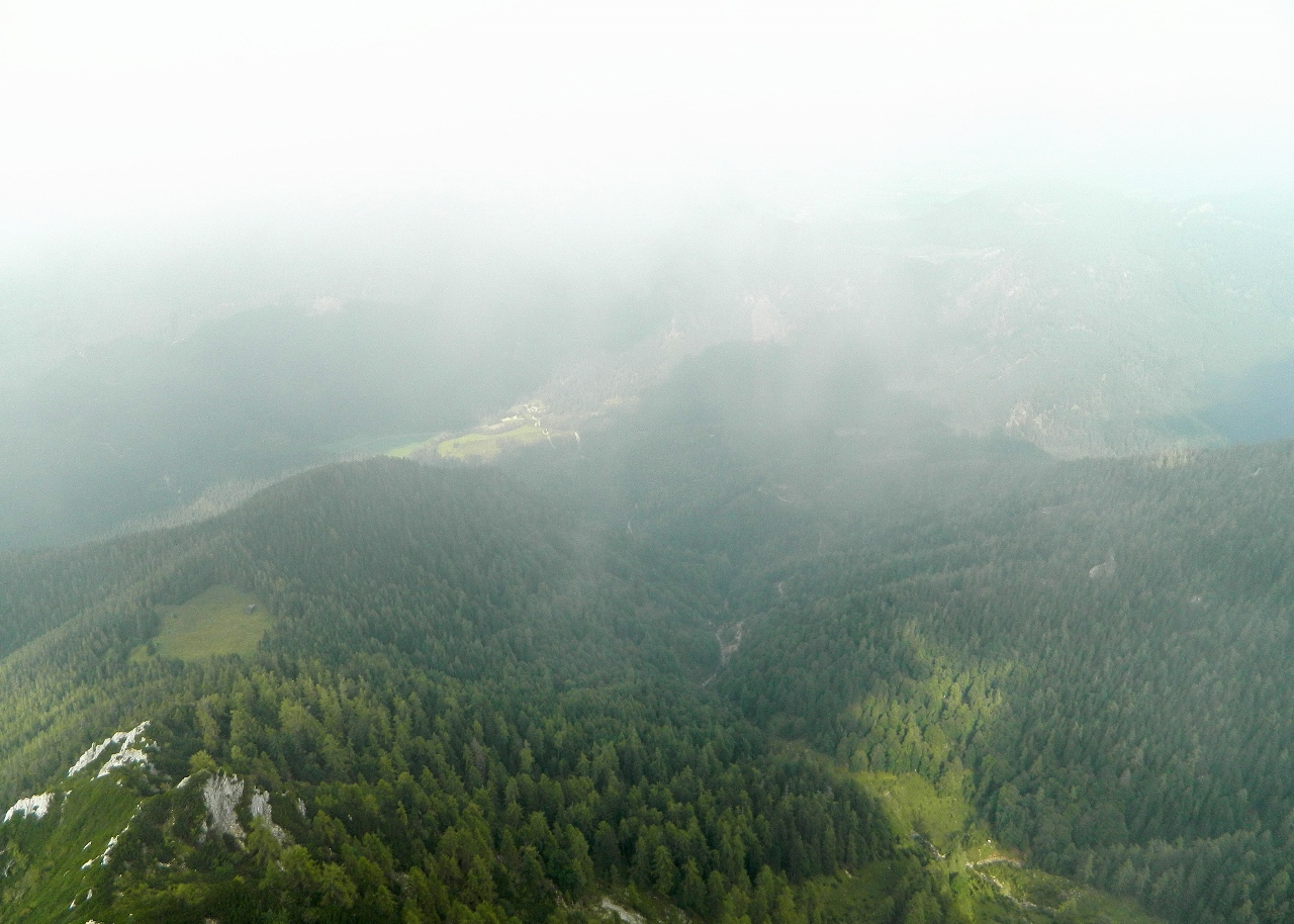 After half an hour the sun had burned through the mists and Simon photographed mountain trails coming into view below us. An unseen herd of grazing cattle chimed musically with their cowbells.