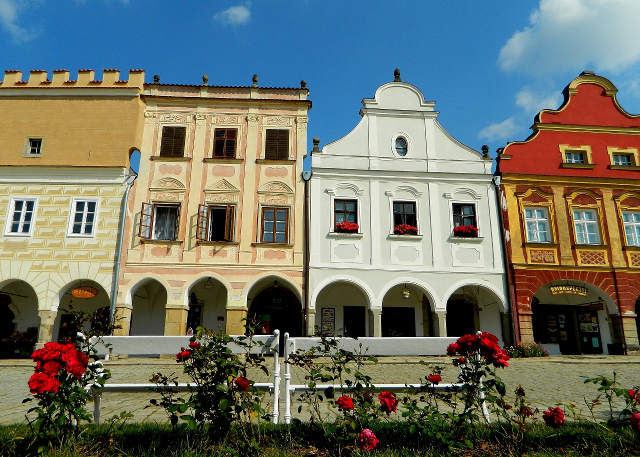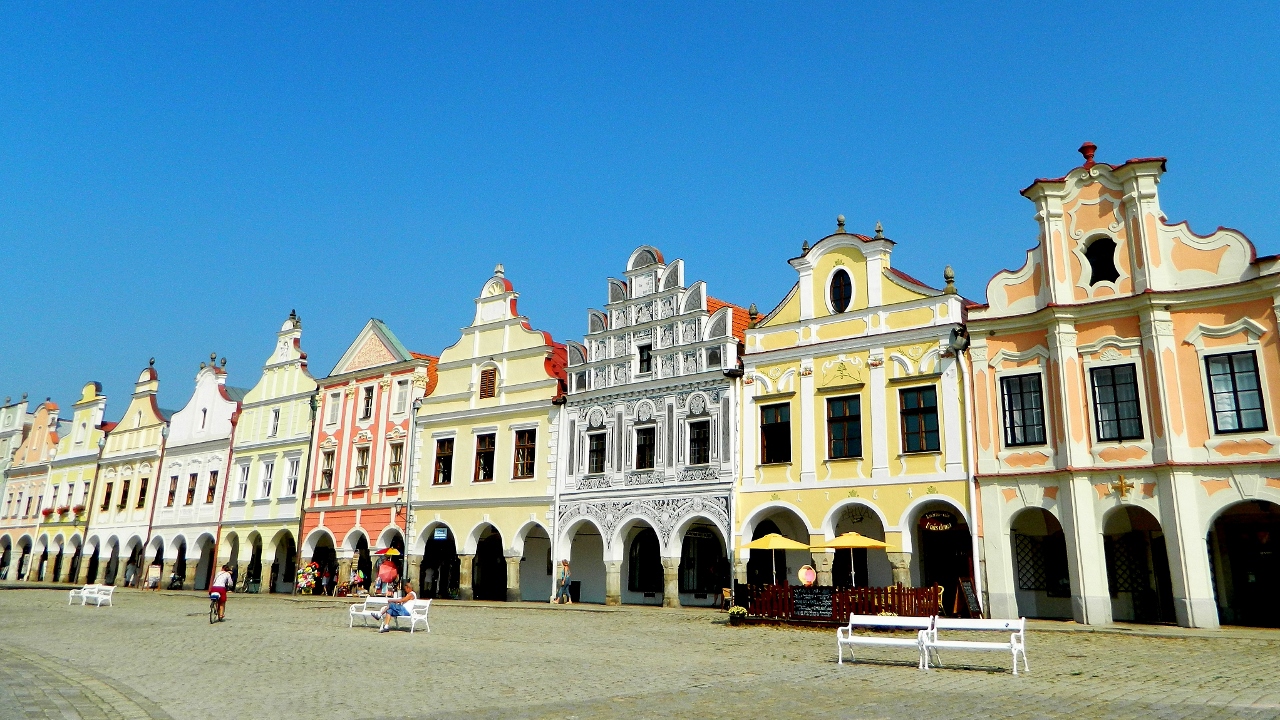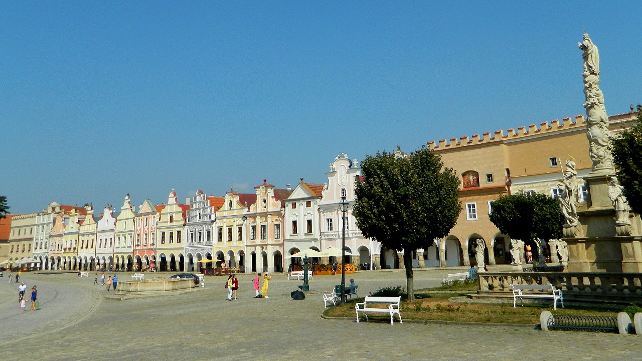 Further south and on border of Bohemia in the west and Moravia in the east we visited Telč. Arriving just as the town’s three churches tolled their bells for noon, and in high heat as the temperature reached 30 degrees, we found its gem of a main square dazzling under blue skies.