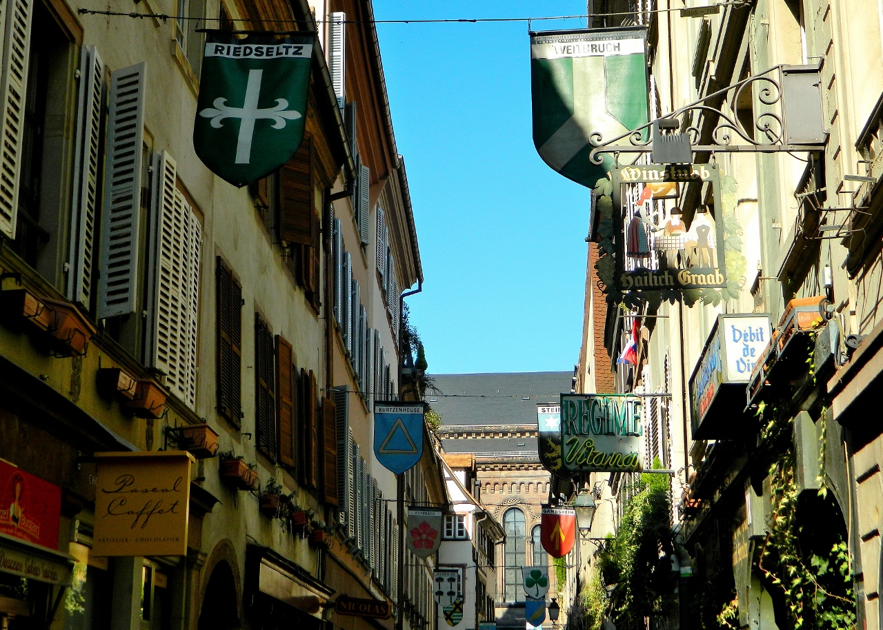 Spotting an archway we discovered a cobbled courtyard decked with white parasols under which people were enjoying glasses of Alsatian wine before the French lunch. Alsatian foods mix German style kraut and smoked hams or river fish with French style cassoulets.