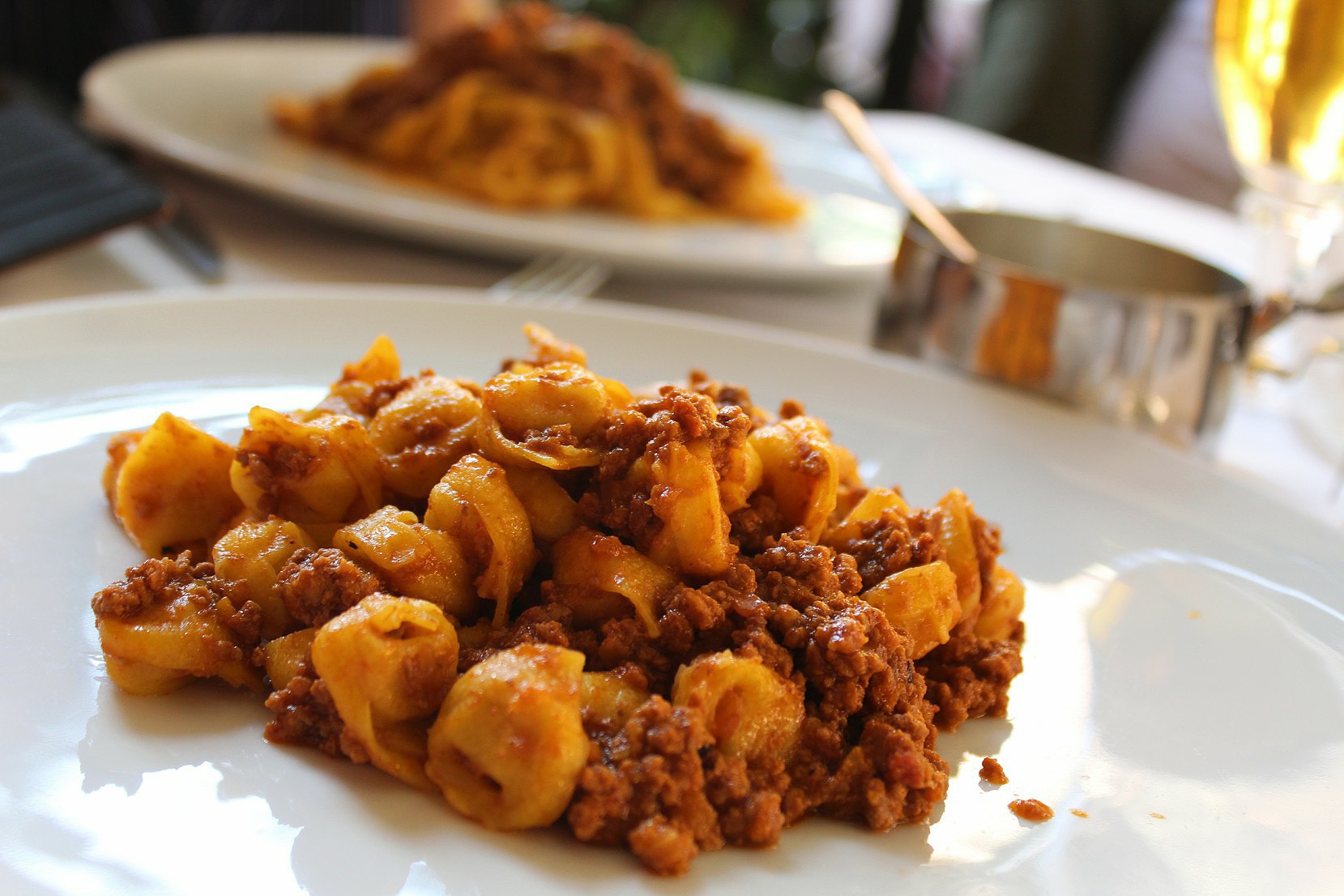 We ducked instead into the narrow streets of the old city market, the Quadrilatero. Busy at lunchtime with tables and chairs hosting diners on the local specialities, tortellini and of course, tagliatelle Bolognaise, the air was rich with the aromas of cooked meat, fish and seafood.