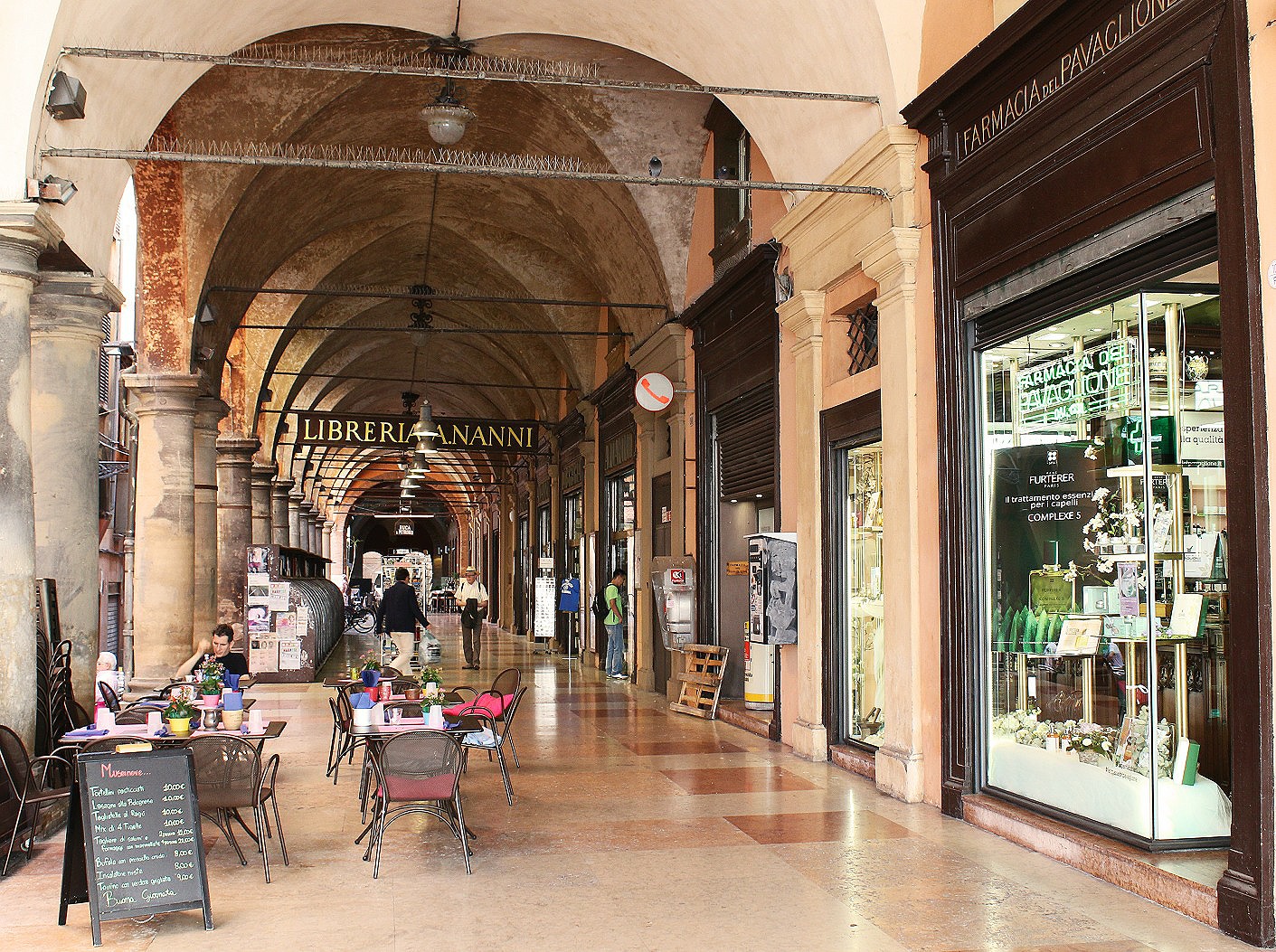 Broad shopping streets such as Via dell’Archiginnasio were arcaded on one or both sides providing cool and shade from a ferociously hot midday sun. There was no point stepping into the stores as they read like a check list of Turin’s Via Roma – all designer clothes shops, shoes and accessories brands.