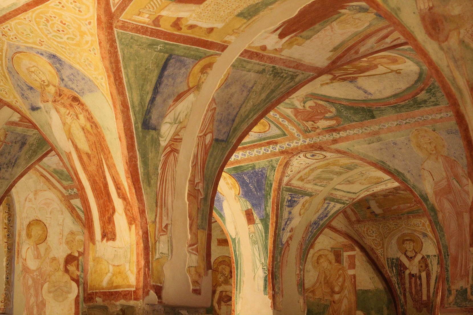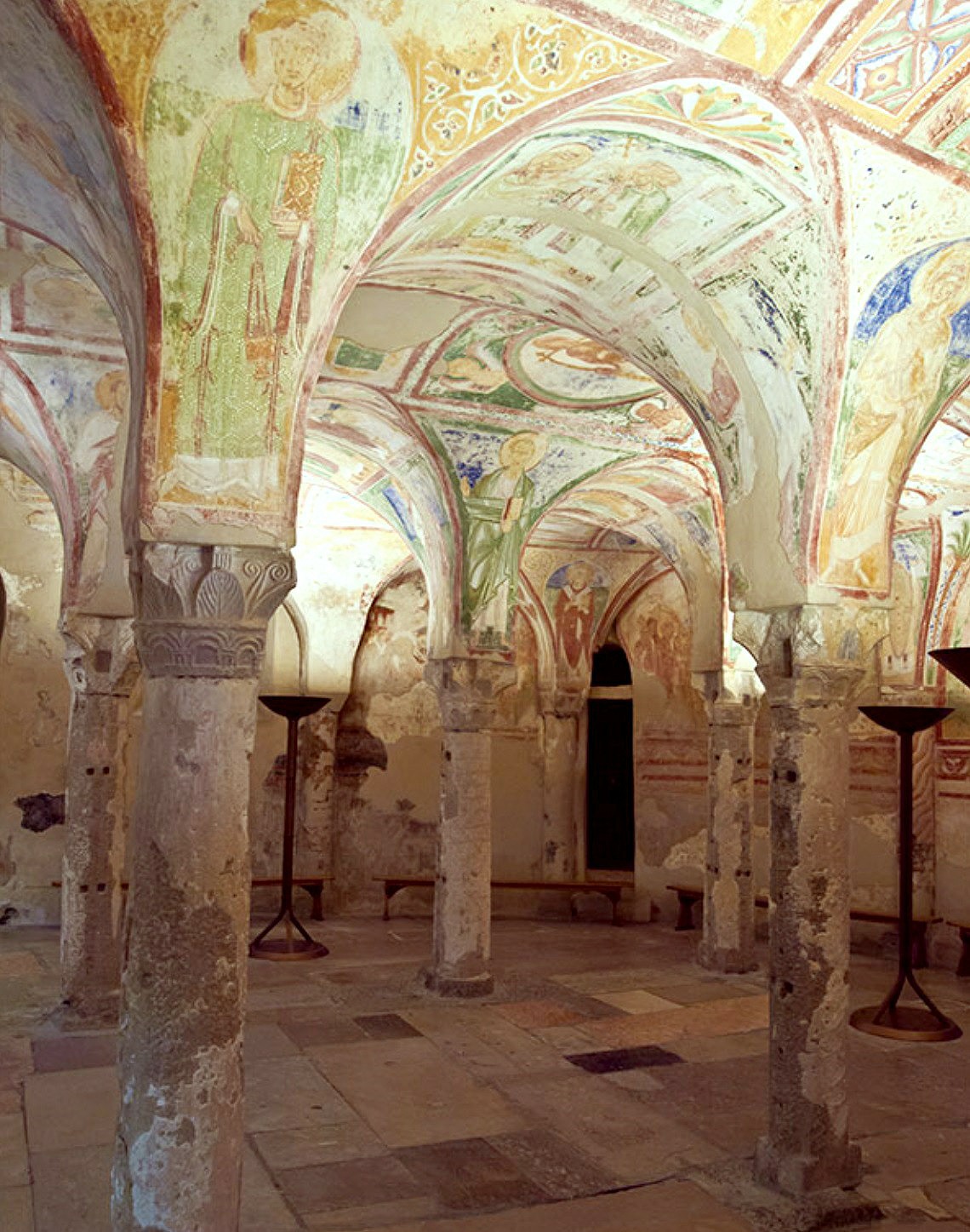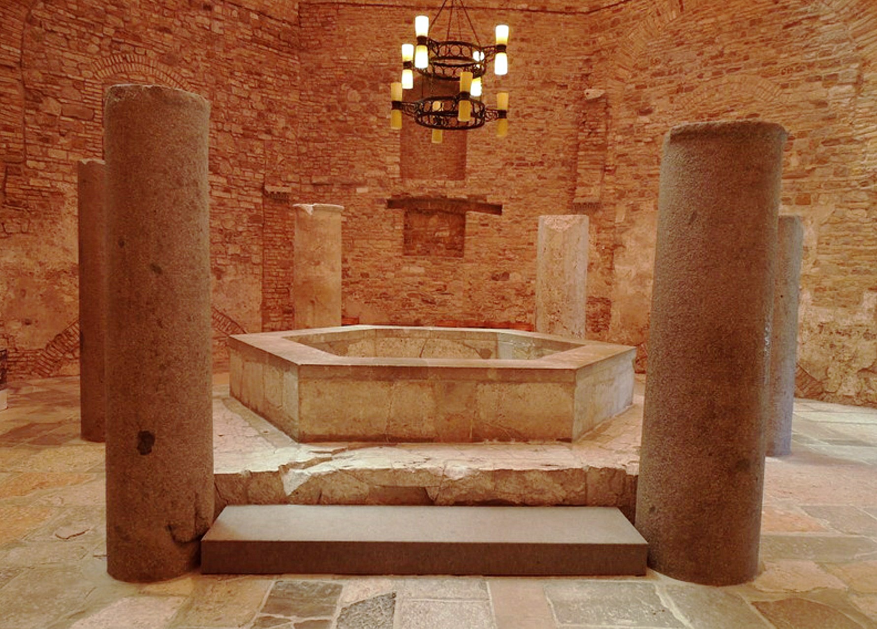 The original 4th century baptistry is partially excavated under a later floor of the extended church complex and is half the size again of the later baptistry built in the 12th century and re-using Roman columns.