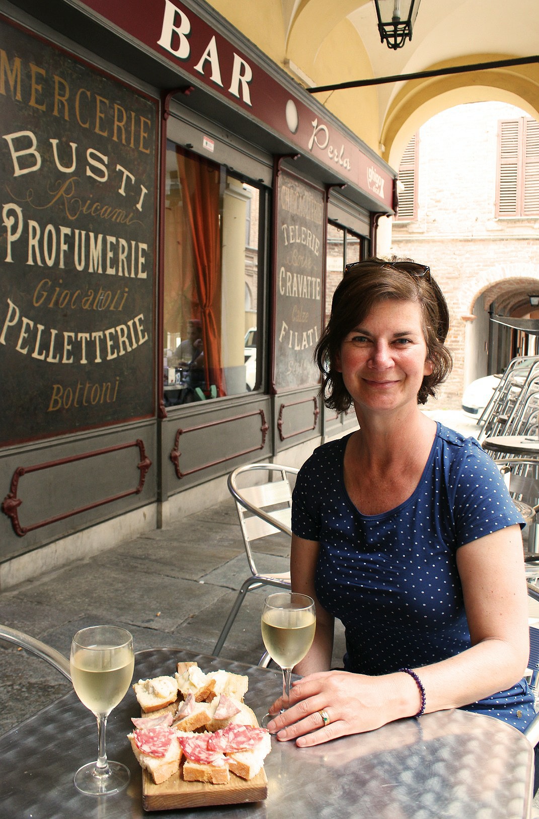 A treat of a country village, on a bluff above the Asti vineyards, San Damiano’s one street was lined on both sides with cool dark shaded arcades in which bakers, pharmacists, shoe sellers, bar owners and hair dressers were still busy at work at 6pm.