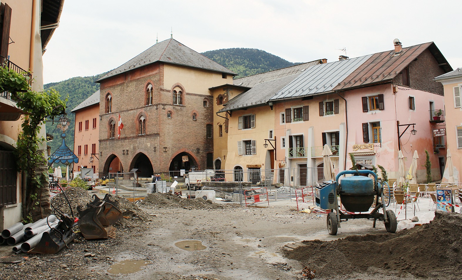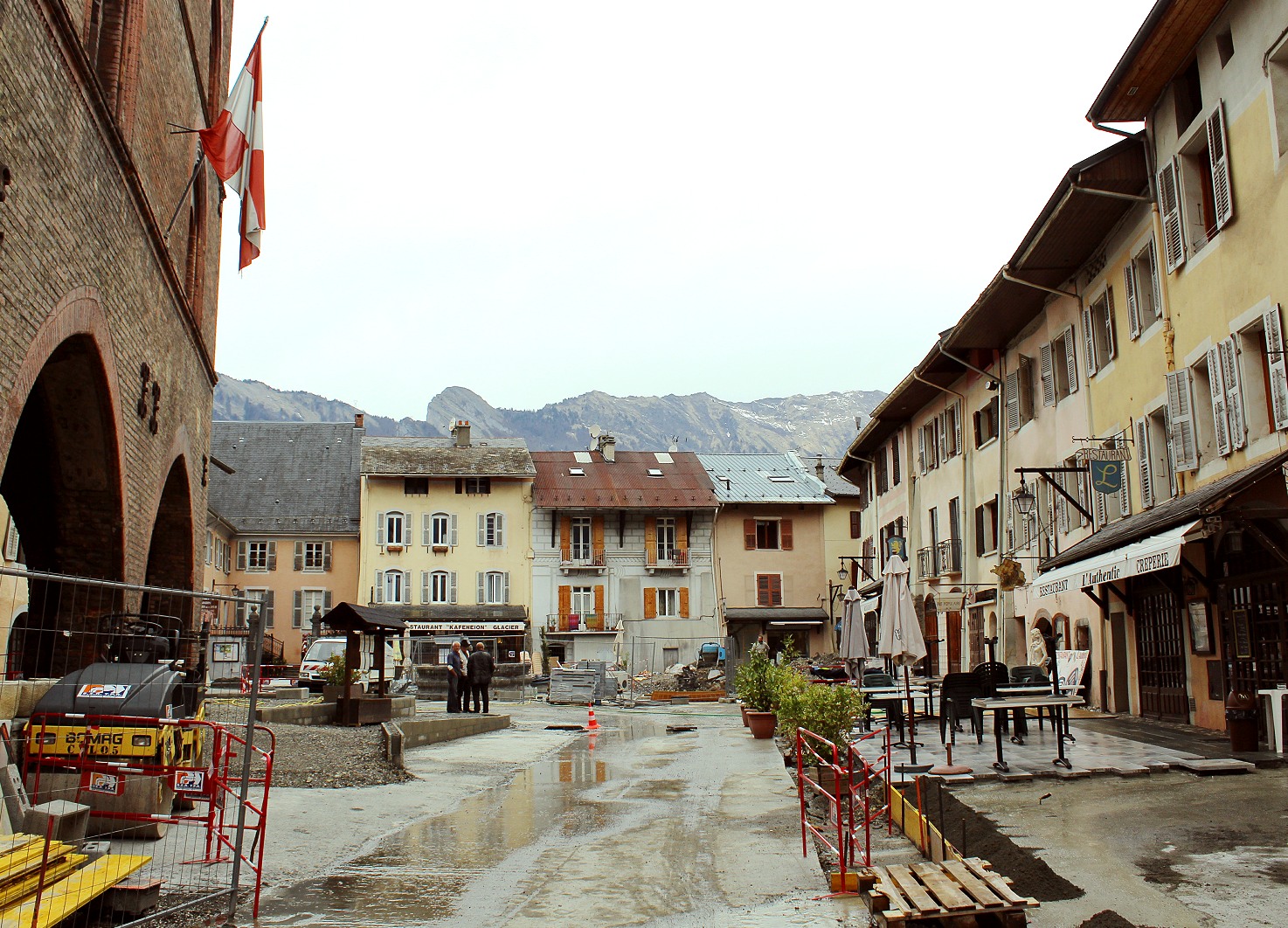 A screeching and reverberating noise loudened as we neared the historical square at the centre of the town, jumping across cobblestones that had given way in muddy ditches. Rounding a corner, we felt rather than saw the jack-hammering of the road way, machinated digging of trenches, laying of ducting and power-washing of muddied medieval buildings.