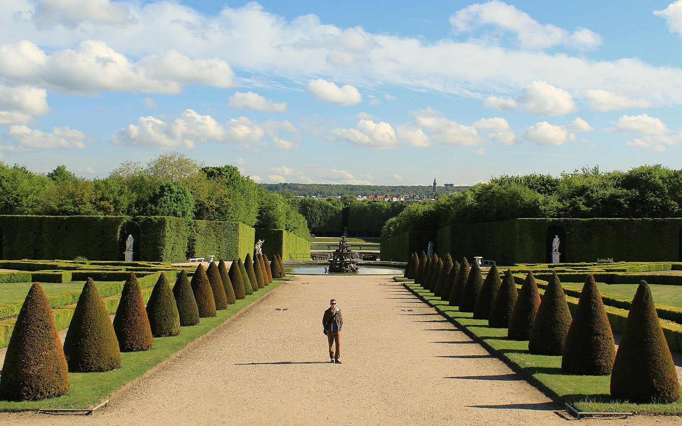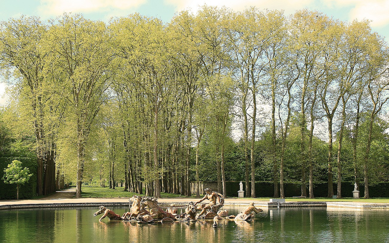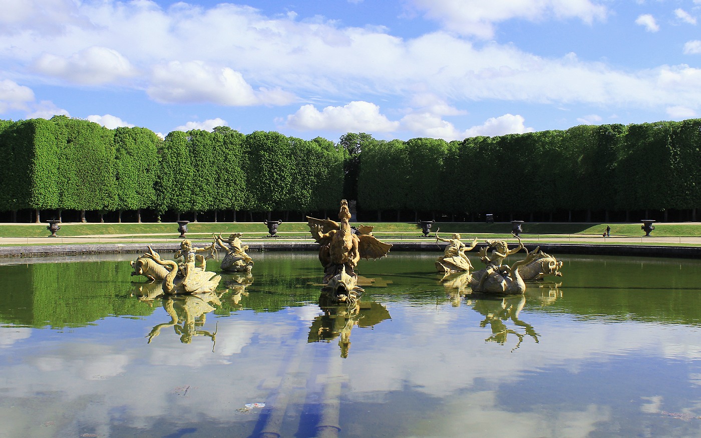 The 34 different gardens linked by avenues of chess piece-like topiary and chestnut trees offered gold gilded fountains, classical allegories, colonnaded theatres, gothic statuary, operatic scenes of the Titans’ war, mirrored pools, bathing nymphs, dragons, water gods and finally, Apollo whipping his sun-towing bronze horses into a frenzy.
