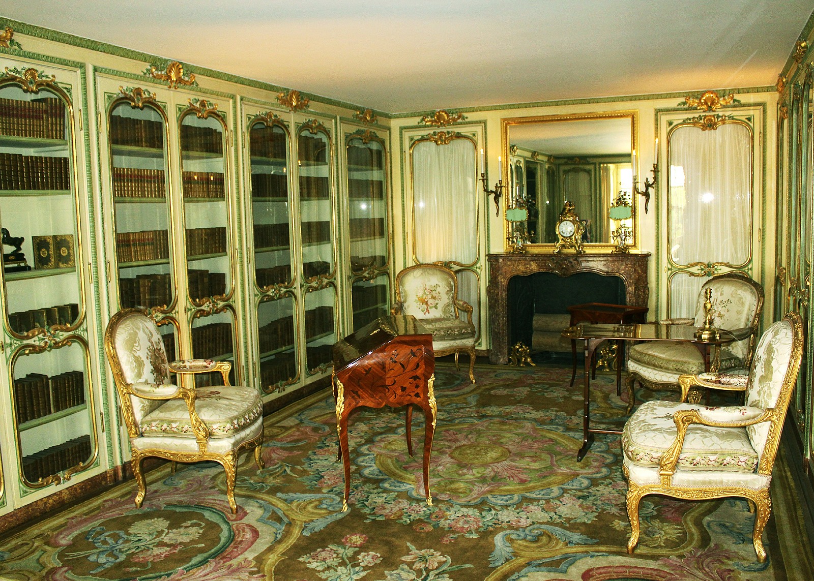 A gold-gilded and green room inter-linked by locking doors and lined with book shelves, decorated as per its last refurbishment in 1783 and sporting a large fireplace (where angry St Just threw his hat?) intimate but large enough to contain an oval table and twelve green chairs (on show in the room just next door and originally from Marie Antoinette’s ‘salon’), could it possibly have been the Green Room? Couthon after all was wheel-chair bound, hardly able to assail the steep stone double stair case up to the former queen’s state rooms.