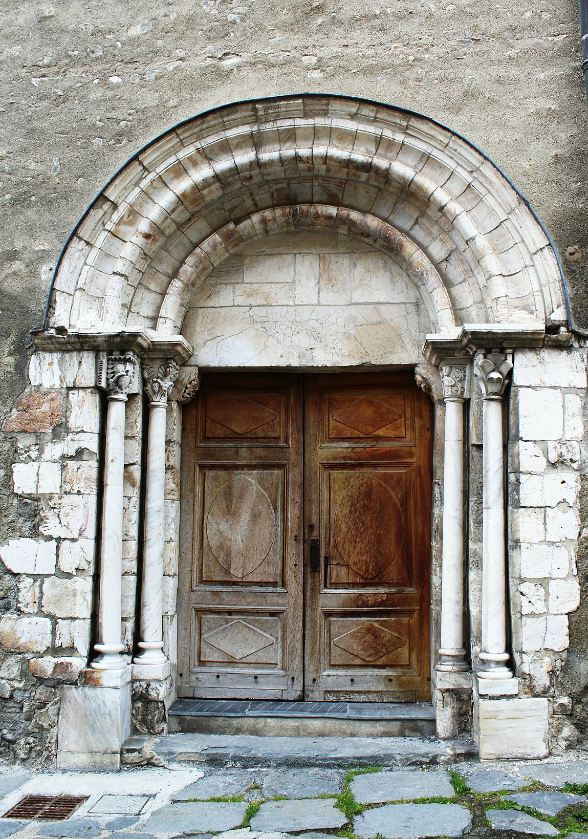A wooden Roman door guarded entrance to the Notre Dame Church decorated by motifs of leafy faces, mythical animals and two bishops tussling over a crozier. It was separated by a road from its 11th century bell tower caused by vandalising revolutionaries in the late 1700s.