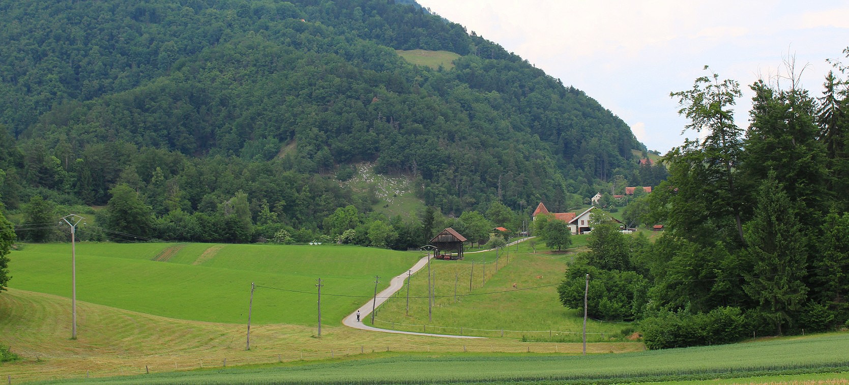 At Prebold we cycled through a wide valley of hops, bewildering at first, then understood to be giant wooden frames along which long lengths of sturdy rope were woven in parallels to train the individual hop plants upwards.