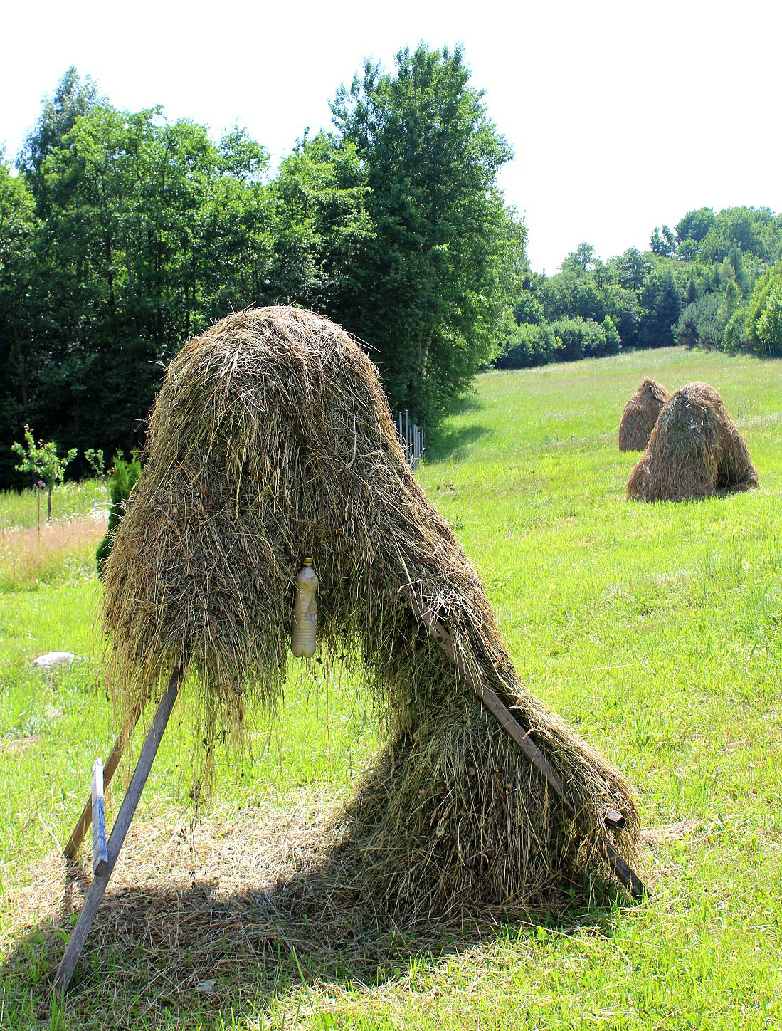 A common sight, incongruous at first, was the many odd-shaped piles of hay that turned out to be shelters for sheep. Built on a simple a-frame the cut grass is layered to dry on the rack whilst being able to provide a sheep or two with shade beneath it.