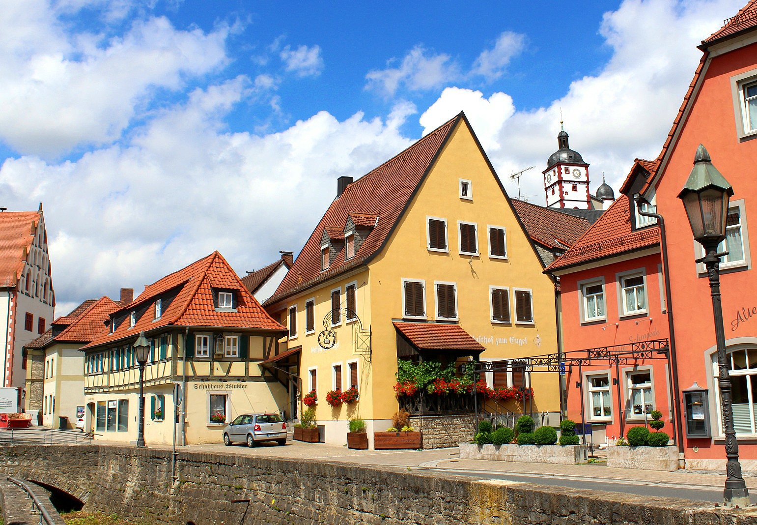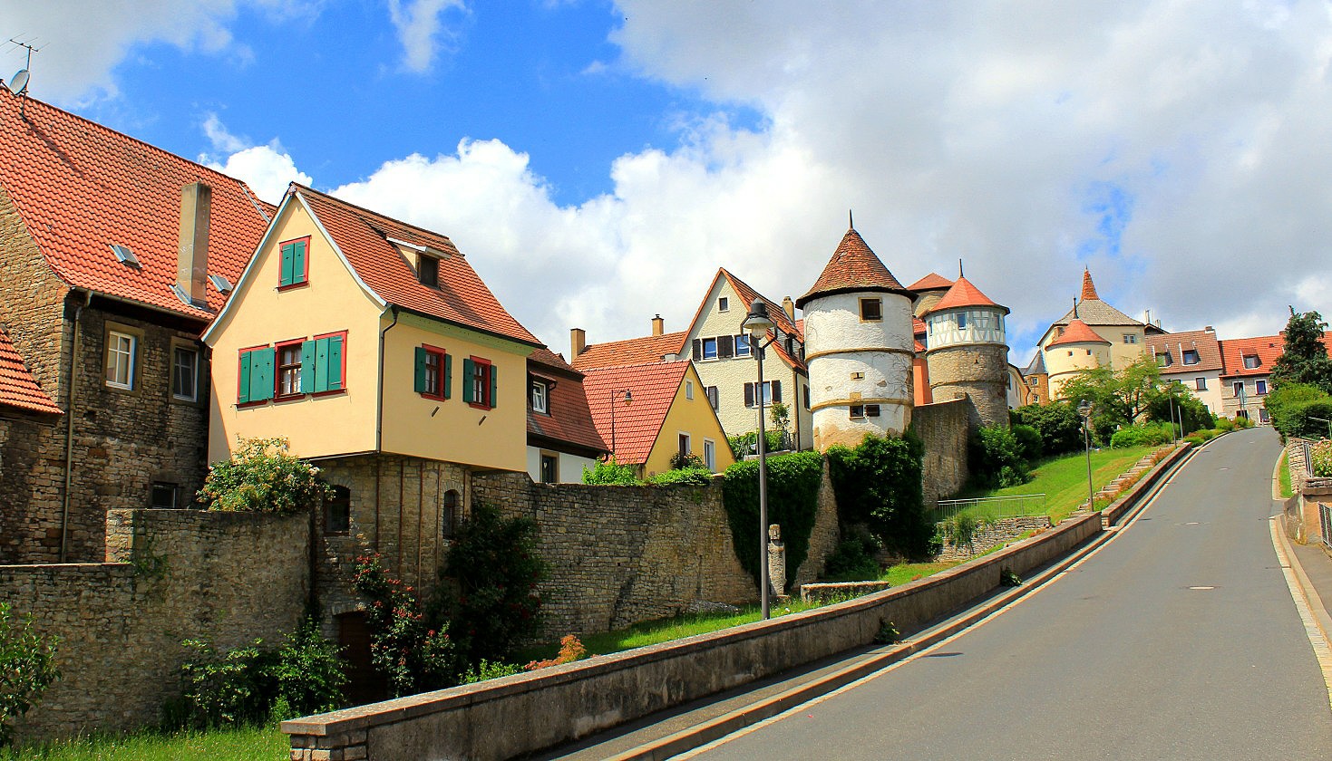 Dettelbach along the river Main’s right bank is prettily set amongst the hillsides of vineyards above the river’s green waters. The almost complete medieval town wall circles the cobbled streets of half timbered houses. Dettelbach has managed to keep two medieval towers and two of its original fortress gates.