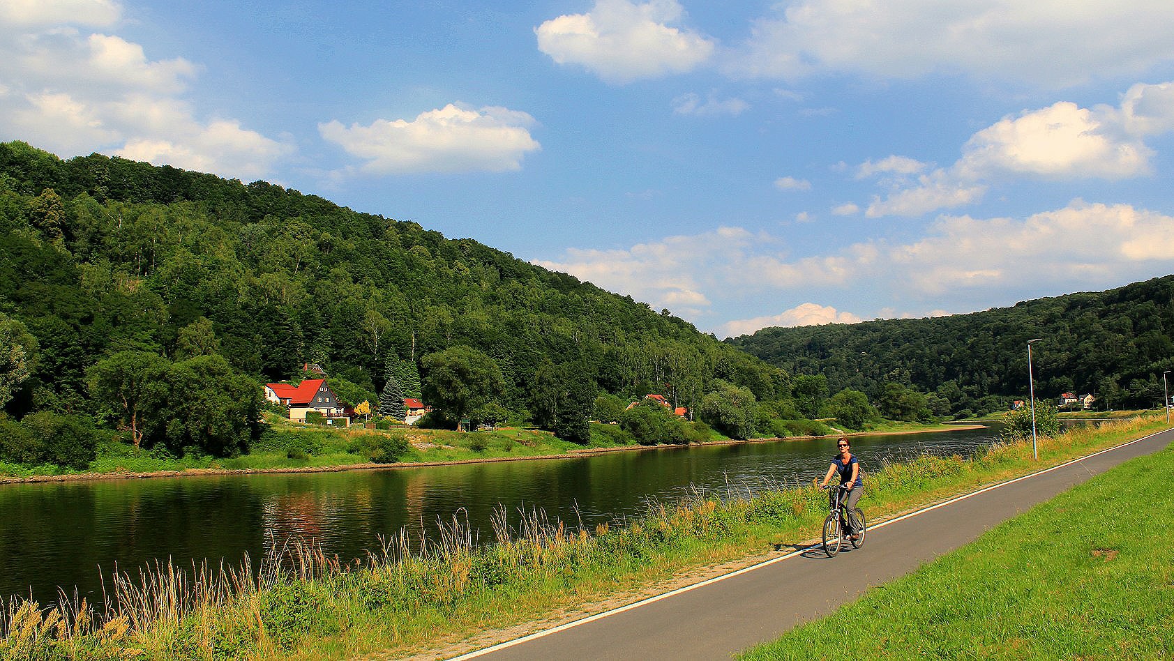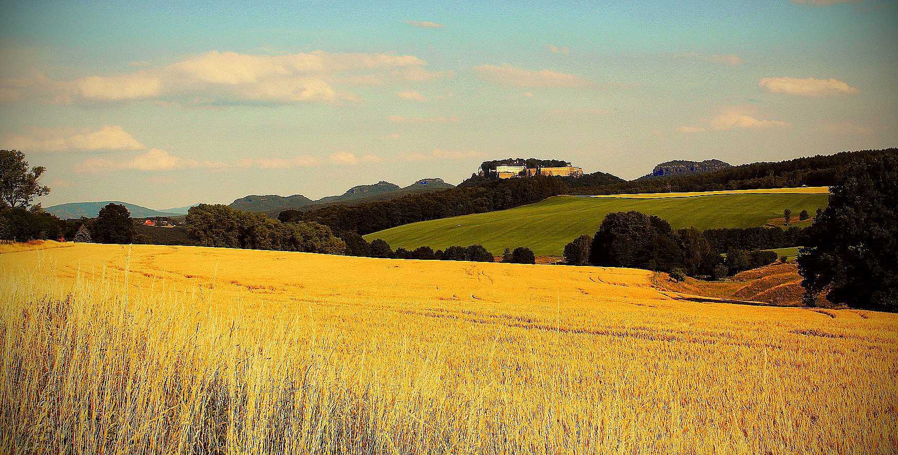 To reach the park we cycled along the Elbe from our hillside campsite at Struppen. Puffing the steep way back to the hillside village in the late afternoon sun we had a rewarding view of Königstein, the tremendous fortress built 400 years ago on a rocky bluff.