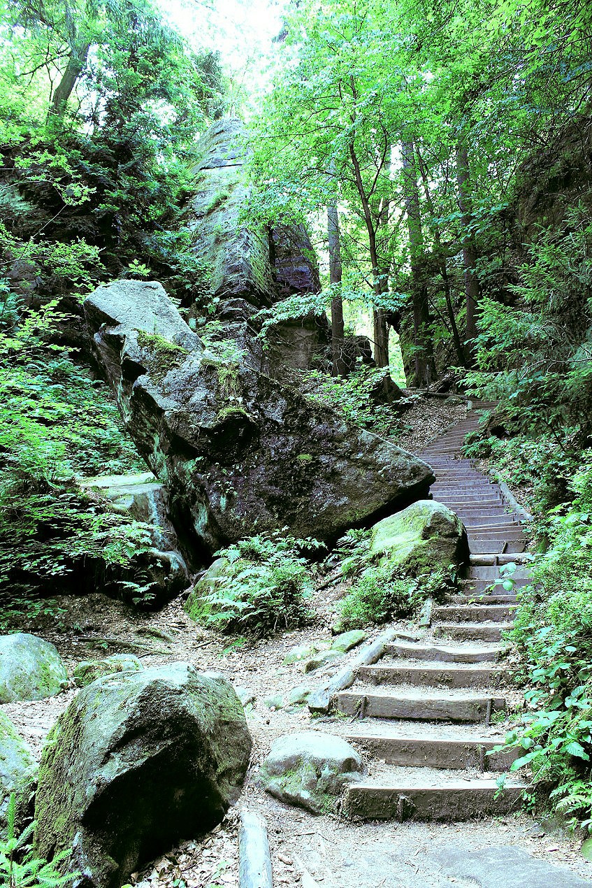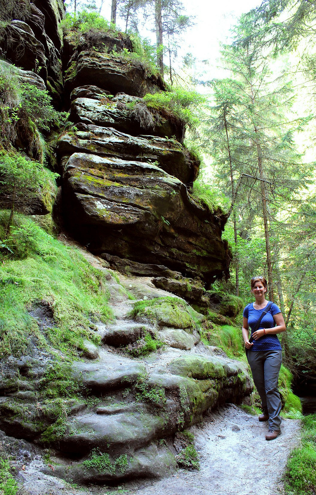 In 1639 during the Thirty Years war after the Swedish Army had attacked nearby villages, peasants fled into the gorge with their scant possessions for safety. It’s hard to imagine how they may have lived out many days there perched on, or tucked within, the mossy green boulders.