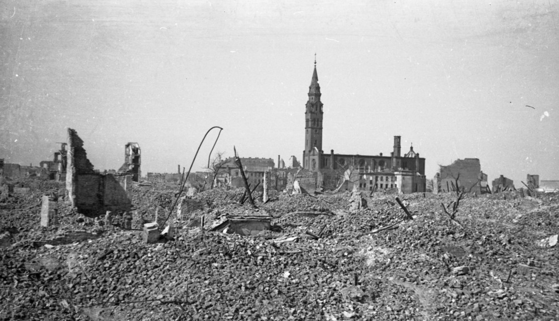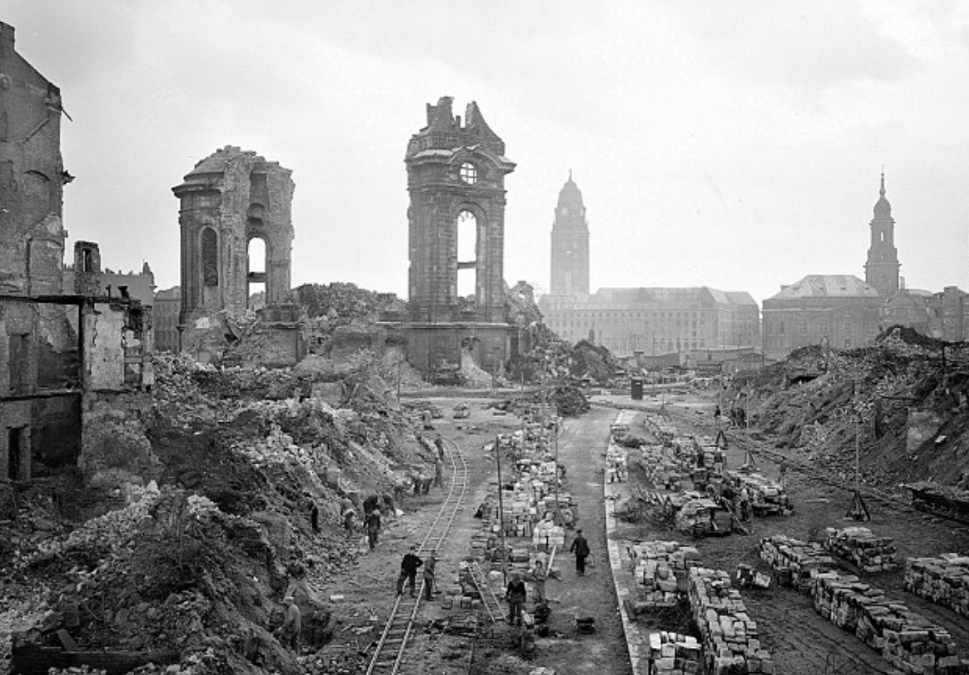 Black and white photographs of Dresden in the immediate and horrific aftermath are blown up in high resolution around key sites, and tour guides carry folders full of the images of shells of historic buildings, smouldering piles of rubble and burnt wooden buildings.