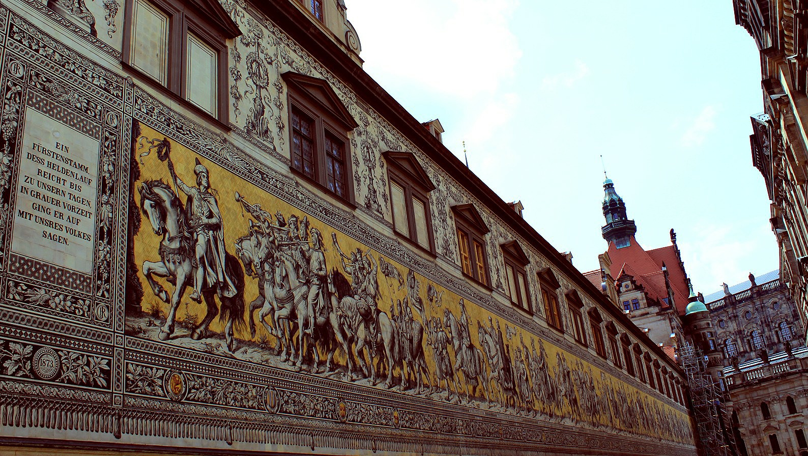 In return, they were immortalised in the Fűrstenzug, ‘the procession of princes’, a large painted mural of 335 feet showing the rulers of the House of Wettin between 1127 and 1904. In the early 1900s the mural was replaced with more than 23,000 porcelain tiles and it is known as the largest porcelain artwork in the world. It survived the bombings fully intact.