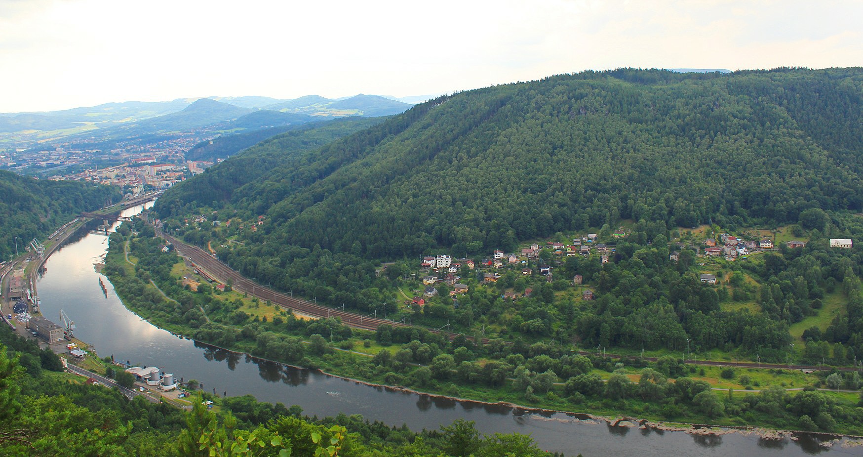 The Elbe river dissects the town from south to north, and is lined with roadways, a rail road and innumerable chimneys that once were the powerhouses of light industry along its banks.