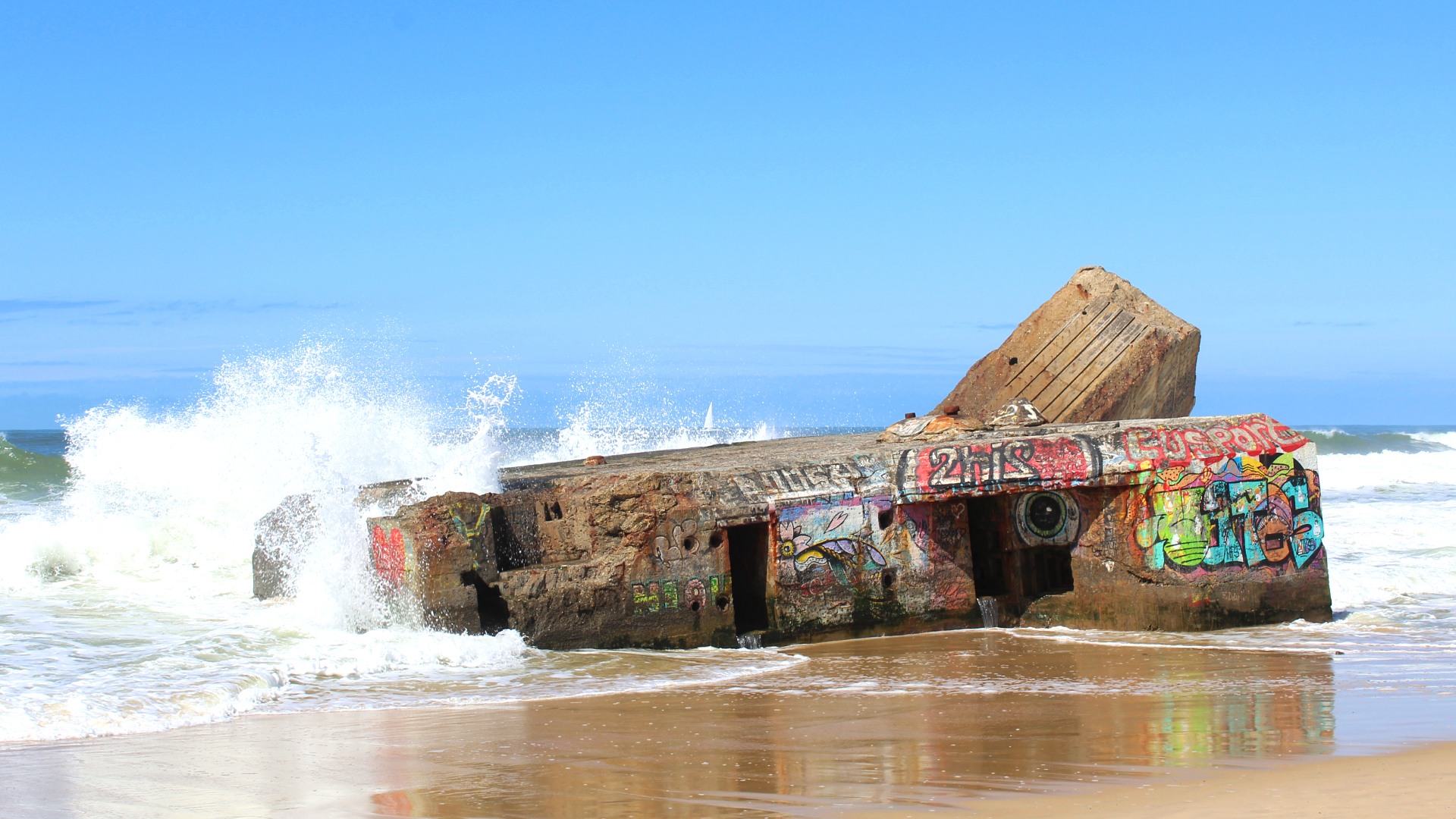 The sea had broken up the concrete pillars and boxes which now formed an interesting art installation, decorated in bright (and very cheeky!) graffiti. Sadly, in the waters flowing around the bunkers we spotted dead fish and seabirds, most likely casualties of the violent wind and hurling waves that had been battering the coast, and which were set to continue for days.