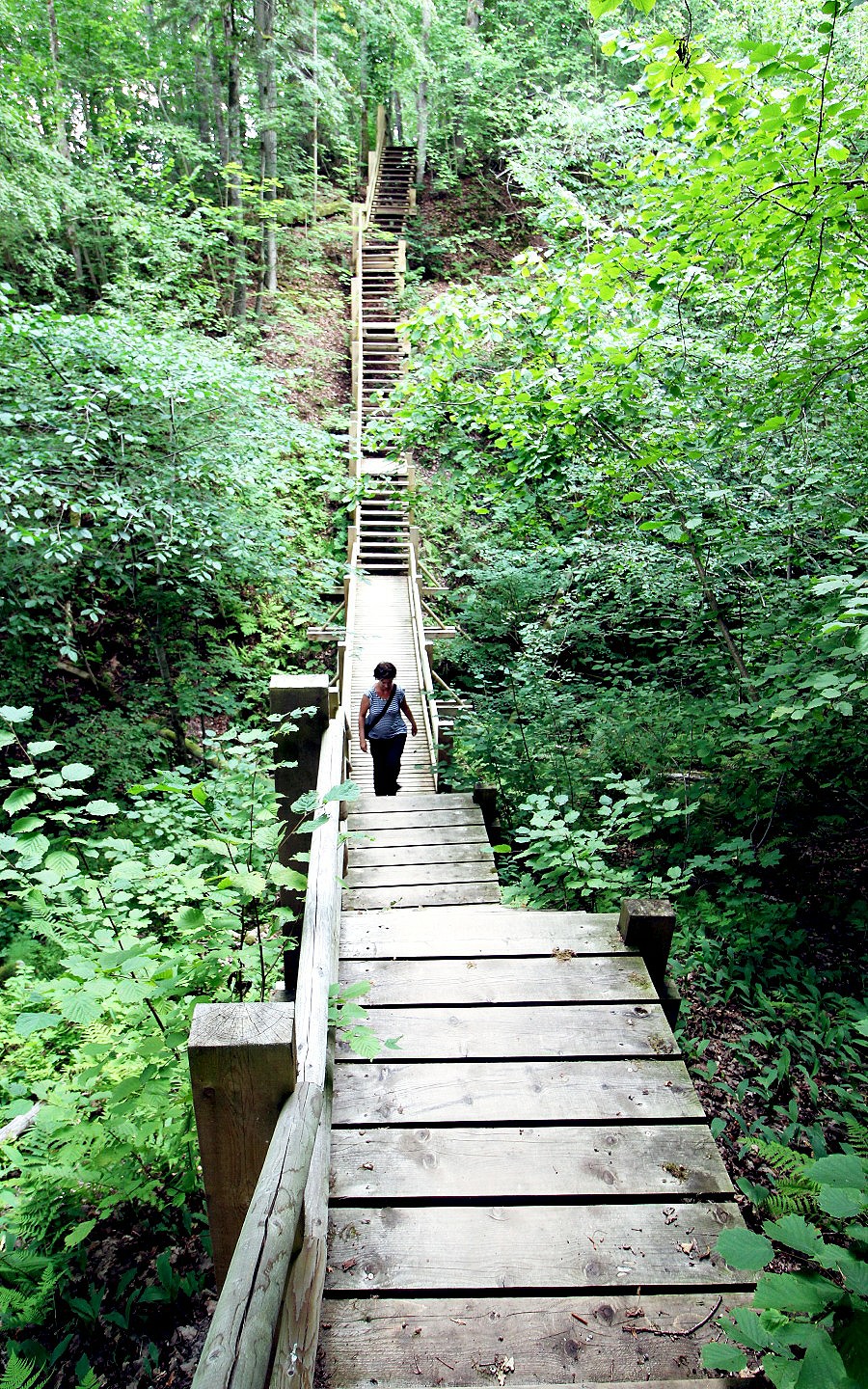 Simon spotted a wooden walkway leading into the dark woodland and we eagerly clambered along it, then confusedly up and down it for a couple of steep miles.
