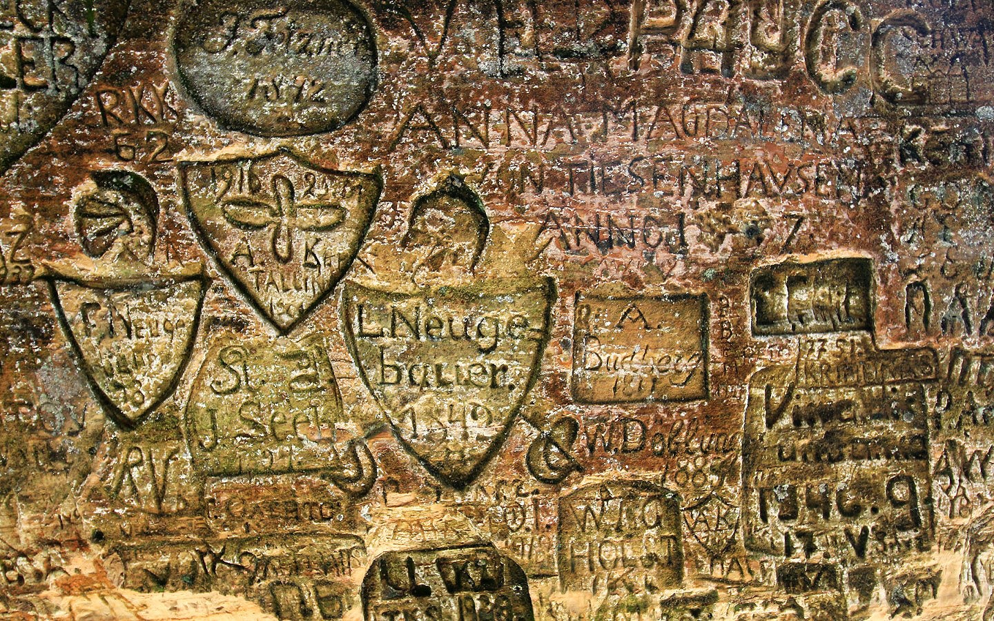 Newly disembarked from a luxury coach they were excitedly snapping selfies next to the compelling carvings of names and endearments dating back to the 1600s which were carved into the giant red sandstone walls of Gutmana Cave.