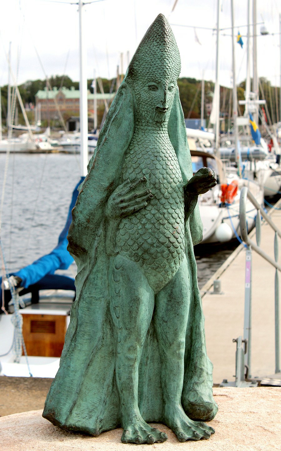 Back at the harbour where we were pitched up and enjoying free, hot showers and remarkably, free washing and drying machines, there was one last treat in store. Perched magnanimously on a large granite rock stood the verdigris sculpture of Biskup Morski.