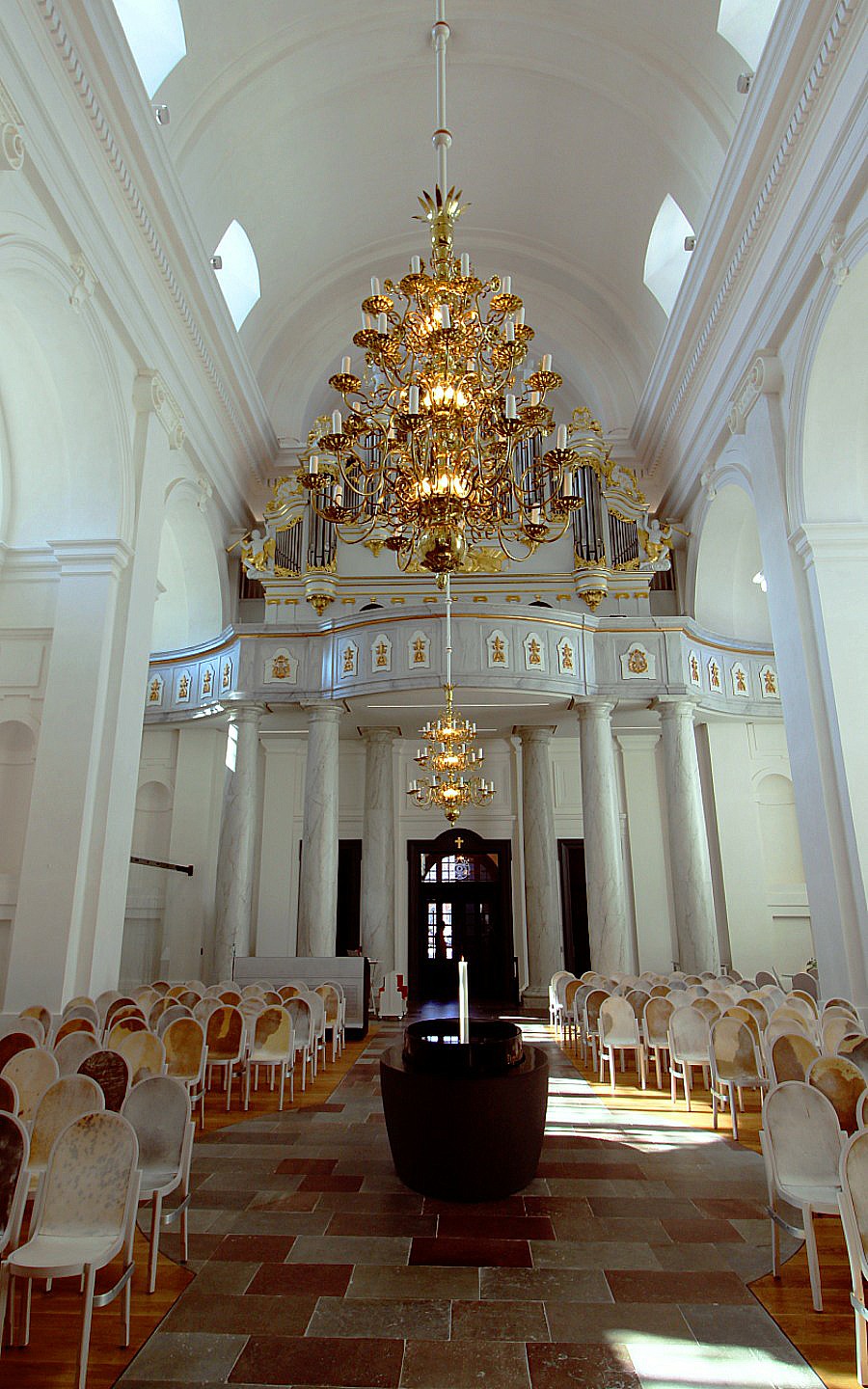Its original gigantically columned and well-lit white interior is the same, but with new additions of a jet black boat-shaped baptismal font and a simple stone alter piece, as well as the latest Scandinavian audio and visual tech to appeal to a modern congregation.