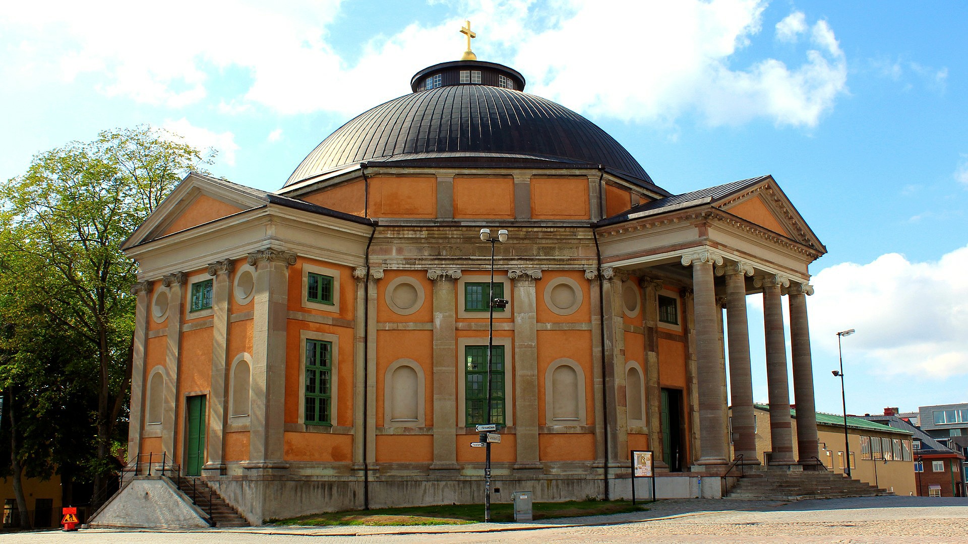 The circular domed Trefaldighetskyrkan (Holy Trinity Church) has an impressive wooden and circular interior, topped with a planked dome painted to look from below as showing three dimensions.