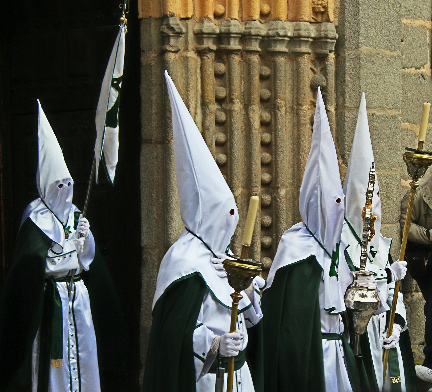 Long before the advertised time of the town’s evening procession at 7.30pm the pretty central square was filling with excited school children, black mantilla head-dressed women and solemn and silk-gowned members of the Brotherhood of St Teresa of Avila.