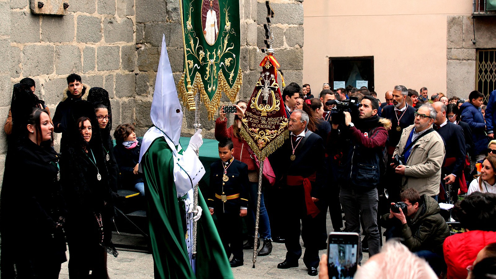 The crowd gasped as the Cathedral doors started to groan and wobble being pulled open from inside, we imagined for the first and only time in the year as at Valladolid. Emerging outside and resplendent in white and green silk gowns and cones the members of the Brotherhood seemed a little confused about the next steps of the ceremony. Which we were surprised by, assuming this is done every year!