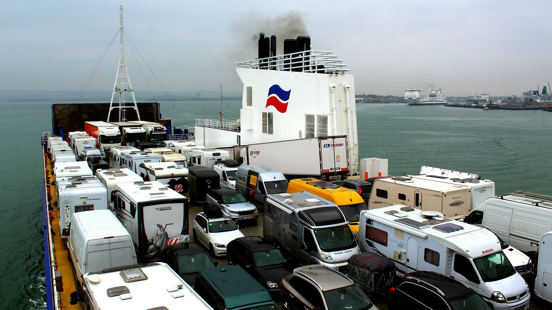 The queue for the early morning ferry out of Portsmouth to Bilbao was strangely short. Instead of being sent down into the galleys to park in the Baie de Seine’s garage we were directed up onto its open deck and instructed to park directly alongside the starboard rails. It was not a great start.