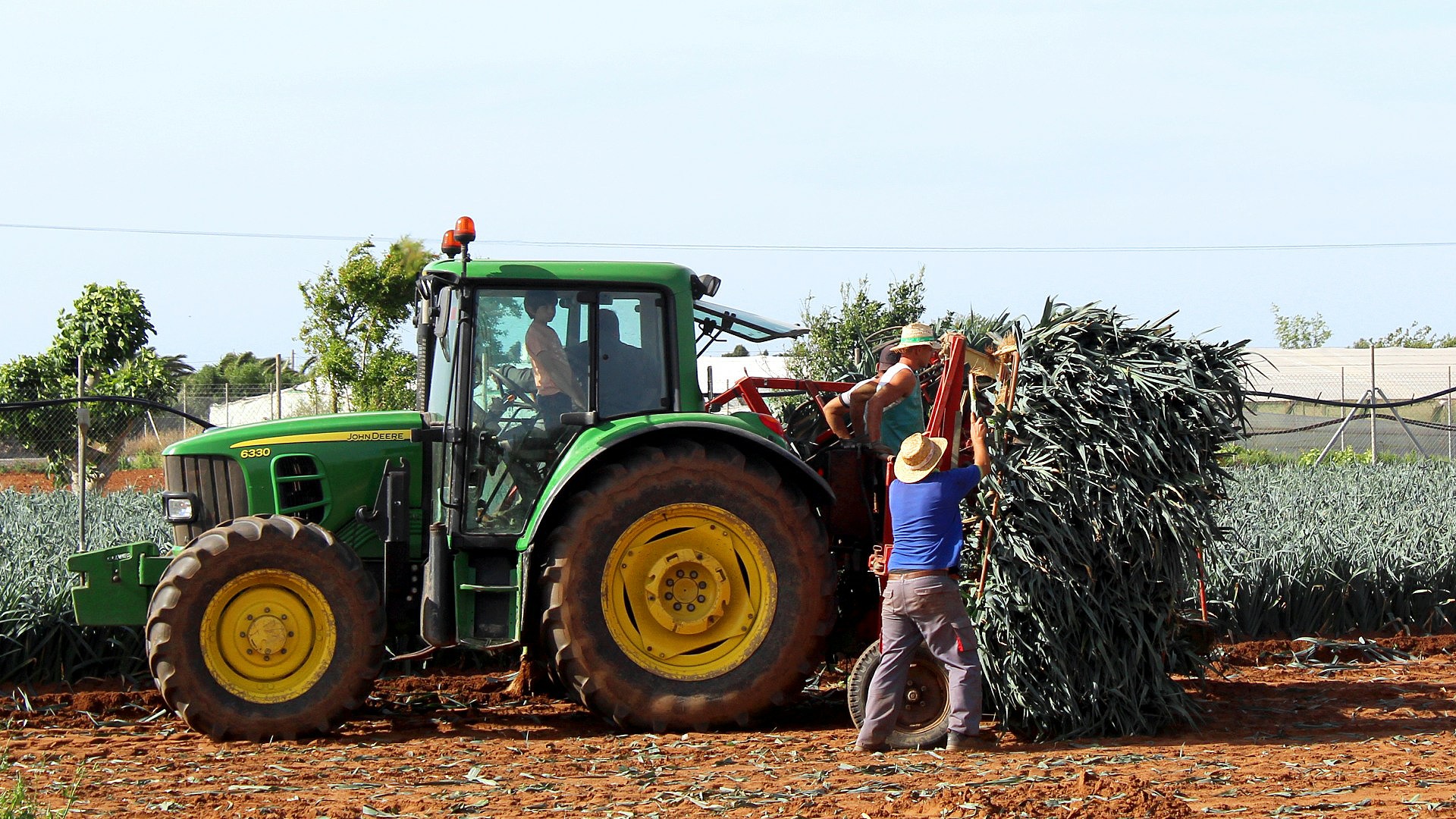 The strong gusting winds blew clouds of red sandy soil around them as they piled bundles of leeks into tall metal cages.