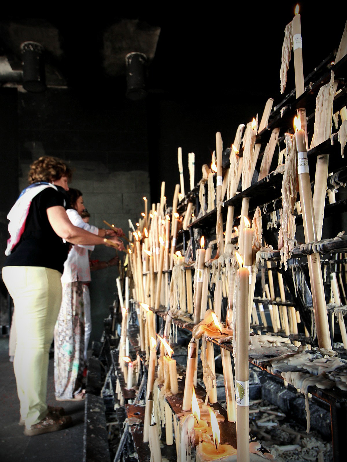 Nearby at the dark and smoky ‘votive’ chapel, local ladies sang strange melodies and kept alight with zippo lighters a tall rack of long tallow candles of devotion to the town’s miraculous statue.