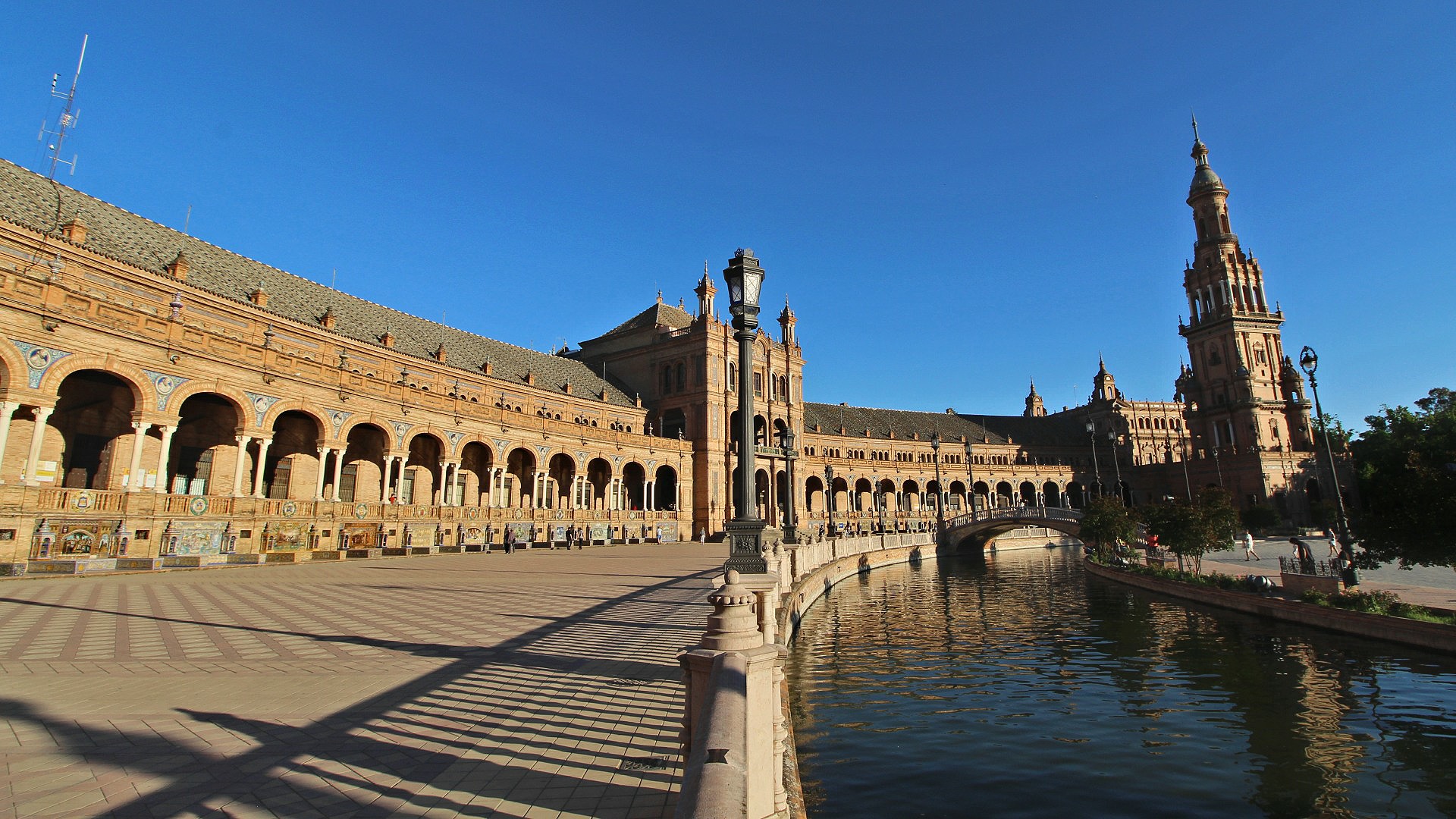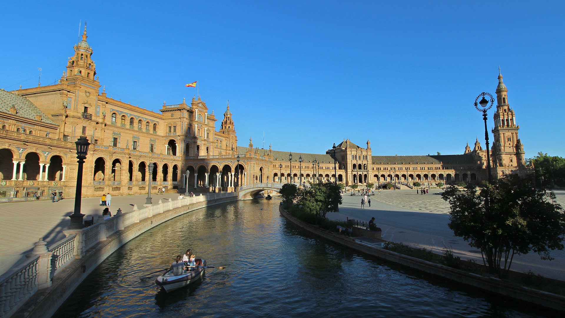 This enormous complex in the Parque de María Luisa looks like an eccentric brick and ceramic palace set out in a semi-circle, around a parade ground networked by waterways and linked by Venetian style bridges.