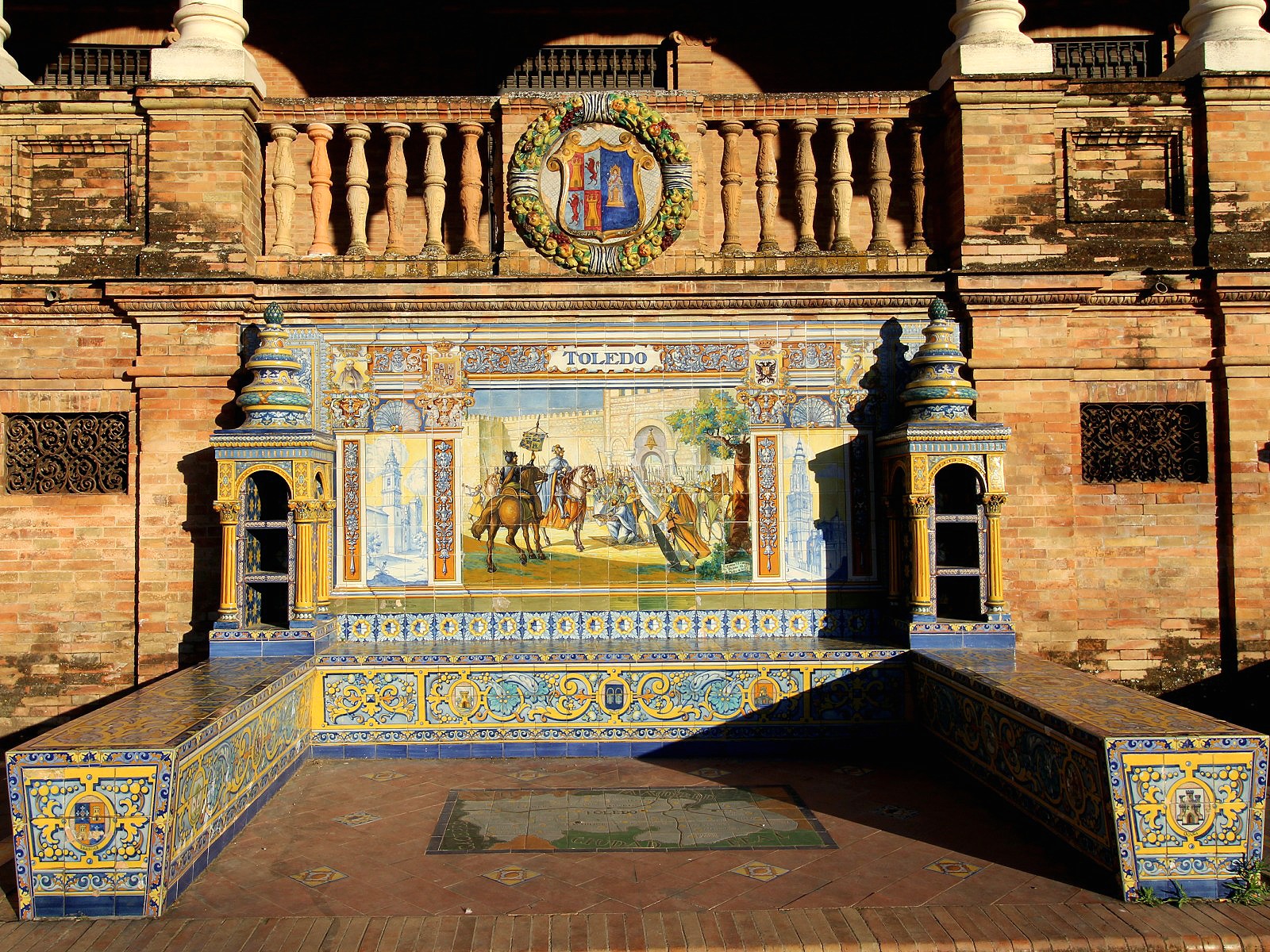 Ceramic tiled booths featured each Spanish region and depicted a historical scene. They added gaudy colour to the brick work.