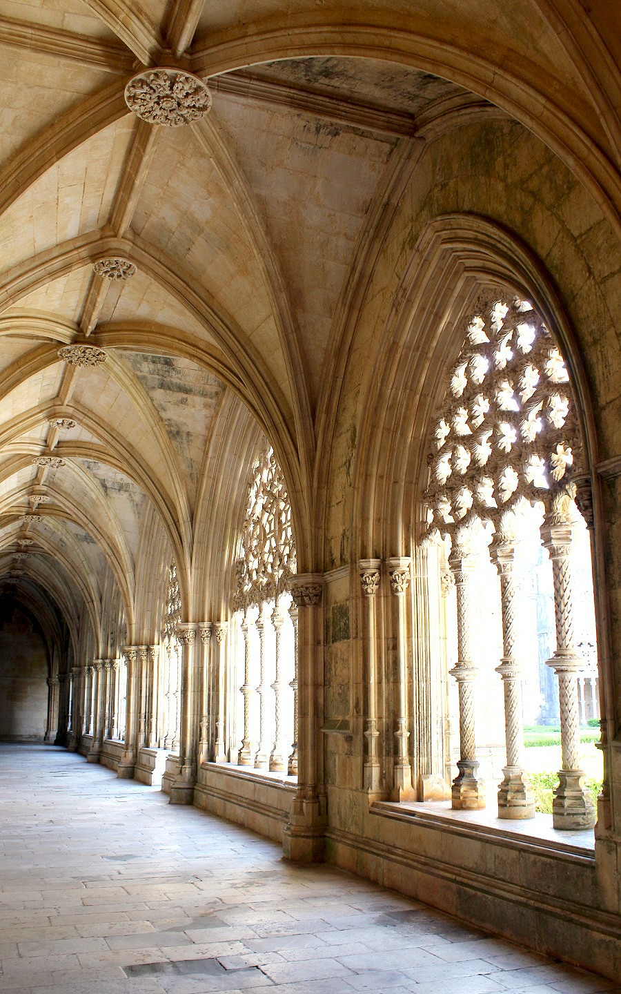 Two very different cloisters separate the interior. The Clausto Real (Royal Cloister) is a riot of writing stonework created in the Maueline fashion. This high art sculpture work reflected a rampantly glorious Portugal in her sea-faring days and uses nautical motifs of rope, knots and seashells intertwined with flowers and vegetation to decorate arches, windows and columns.
