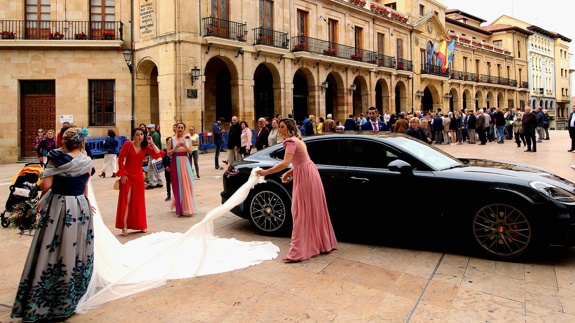 The bride arrived with a multi-coloured brigade of bridesmaids who looked as if they had chosen their own dress in disregard of each other. A couple of guests muscled in to help unravel the bride’s wedding train at her apparent disgust. If looks could kill! Meanwhile the new mayor descended the old stone steps to cheering applause from locals.