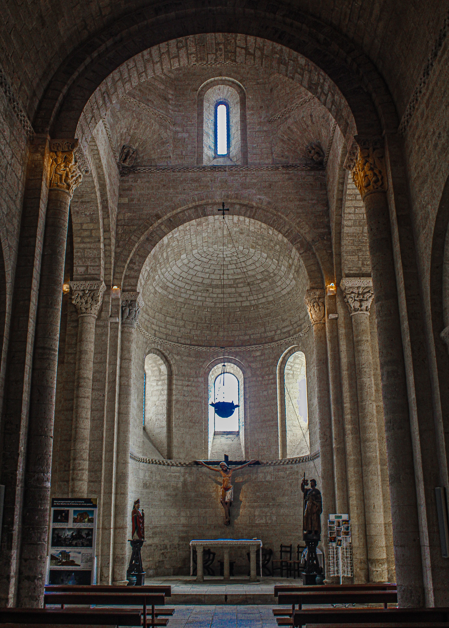 Purely Romanesque in style it features twin towers, a domed basilica, arched and columned doorways and windows and eight interior columns topped with elaborately sculptured capitals featuring 309 figures of humans, animals, monsters, vegetables and flowers woven together in stone.