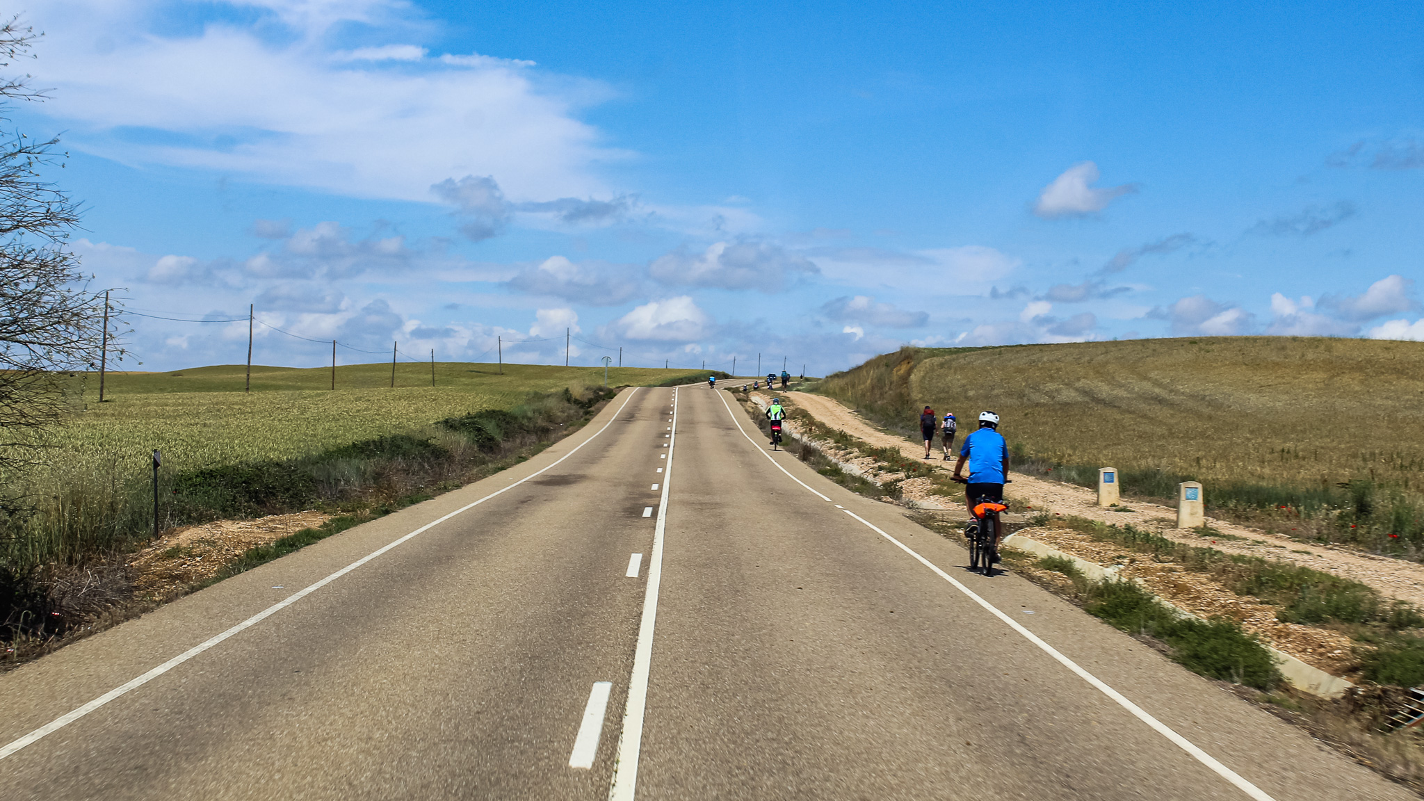 Most were carrying heavy-looking back packs and many had walking poles or staffs. The track was unpaved and stony. Passing them were lycra-clad cycling peregrinos pedalling slowly up the long incline to the hilltop town of Carrion de los Condes, everyone’s lunch stop.